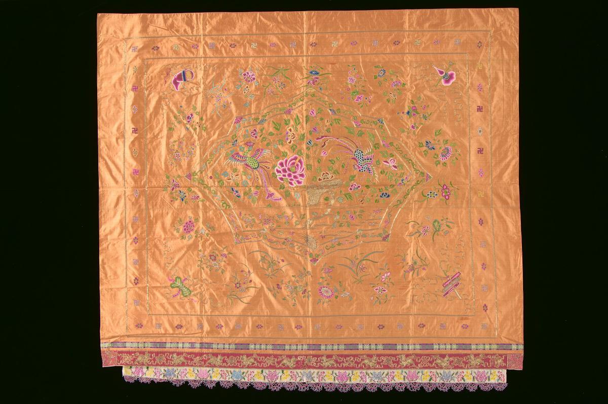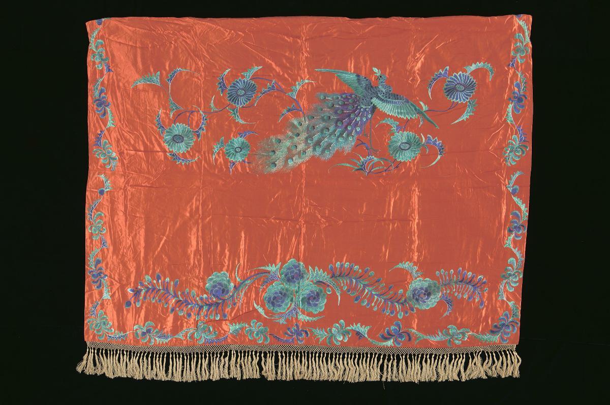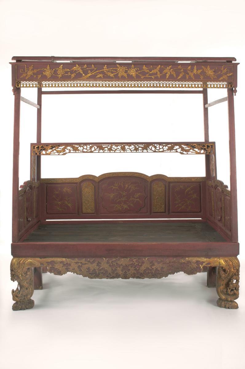 This bed was imported from China, probably from the City of Fuzhou, by the early Chinese settlers in Singapore. It would have been equipped for use with a shallow mattress, folded quilts and hard pillows. Its curtains were often held up during the day by large sickle-shaped hooks. The small compartments recessed into the bed were meant for storing the owner’s personal effects. It is decorated with an intricately carved panel at the top, and red pigments.