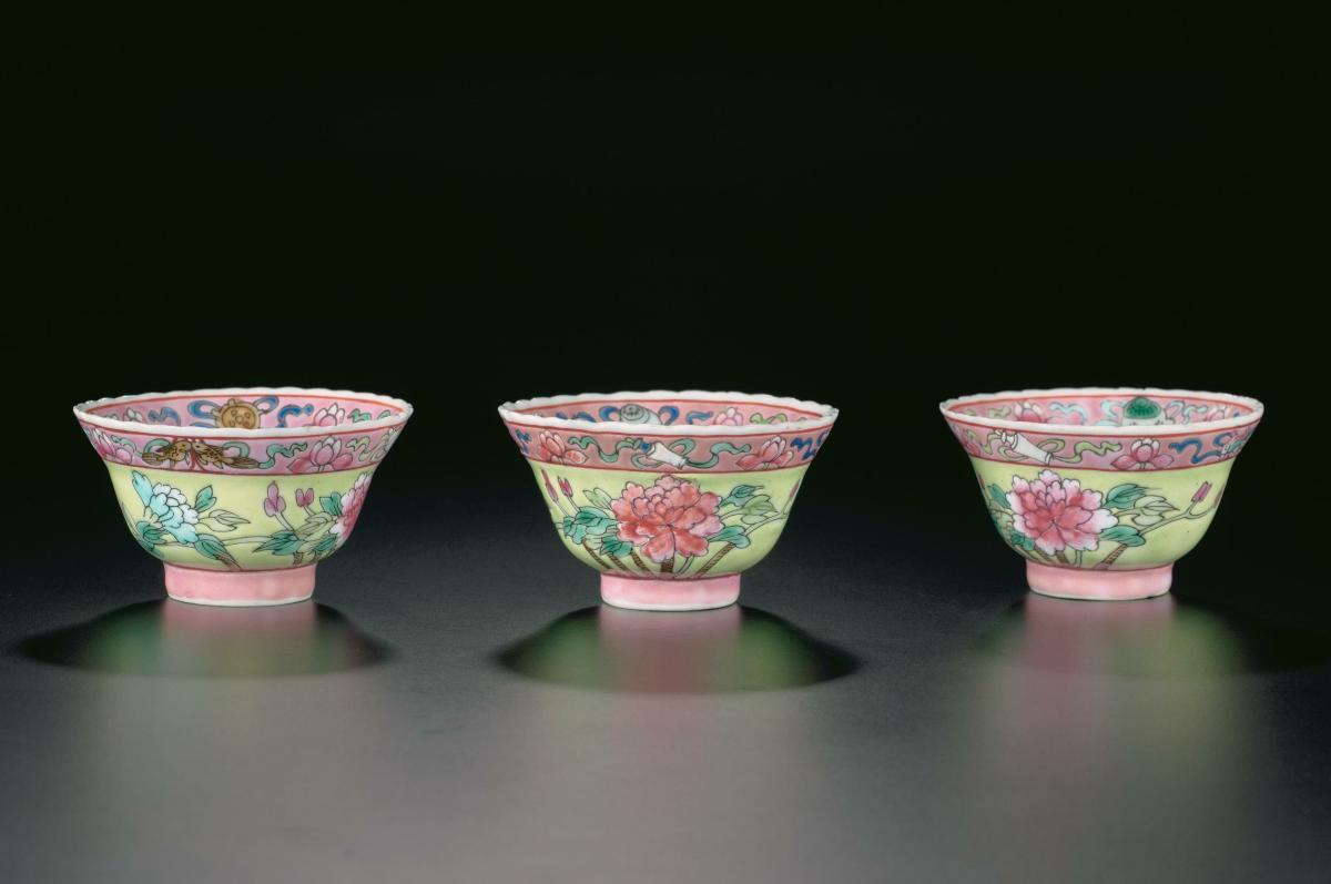The collective Baba Malay term for dining ware is 'pinggan mangkok', which literally means 'plates and bowls'. The dinner service can also include cups, saucers, spoons and spoon rests. Wealthy Peranakan families often commissioned the highest quality porcelain wares for special occasions that would bear their surnames. Teacups are one of the most common items in Straits Chinese porcelain. They would have elaborate decorations of phoenix and peony motifs, and colourful enamelled backgrounds of green, yellow and rose pink. Coral red is an auspicious colour on Nonyaware. It occurs rarely possibly because the colour was reserved for imperial use in China.