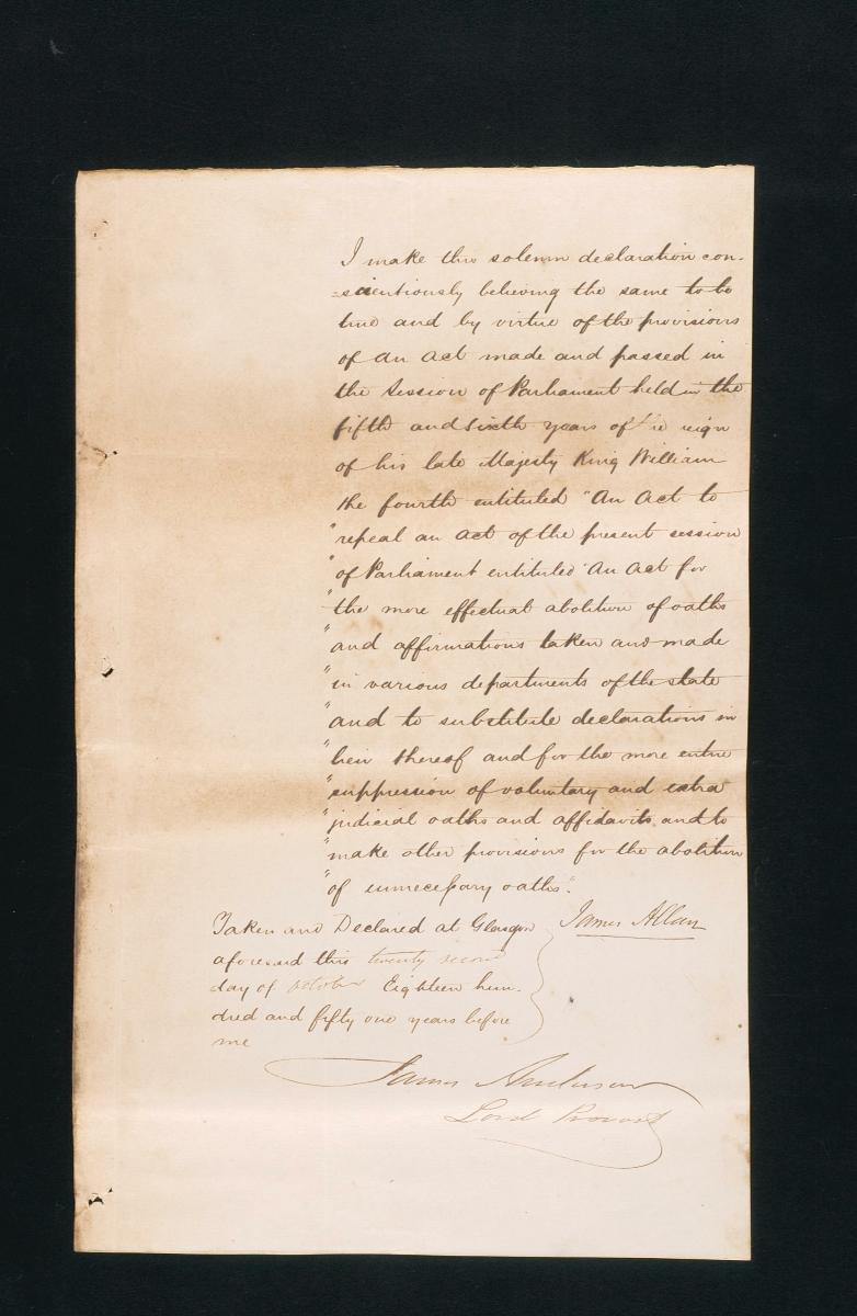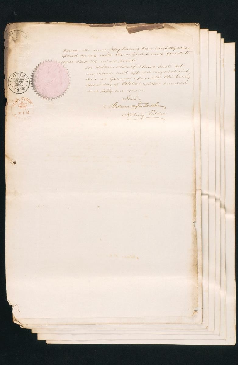 These documents are the declaration and the power of attorney concerning the administration of the estate of James Stephen. The declaration was sworn by James Allan and Richard McCulloch (who were both clerks in Glasgow) on 22 October 1851. They declared that they witnessed John MacDonald (merchant in Glasgow), Walter Scott Lorrain (merchant in Glasgow), Robert Duff (merchant in Singapore), William MacDonald (merchant in Glasgow), Robert Bimming, and Henry Constable name and sign the power of attorney dated 21 October 1851, which was annexed to their declaration. These documents are part of a collection of legal documents from the 19th and early 20th centuries which provides a glimpse into the work of the notable personalities who left their mark on Singapore’s legal history, and the economic and other transactions undertaken by ordinary immigrants in 19th century Singapore that tell stories of misfortune and indebtedness which would otherwise have disappeared from history.