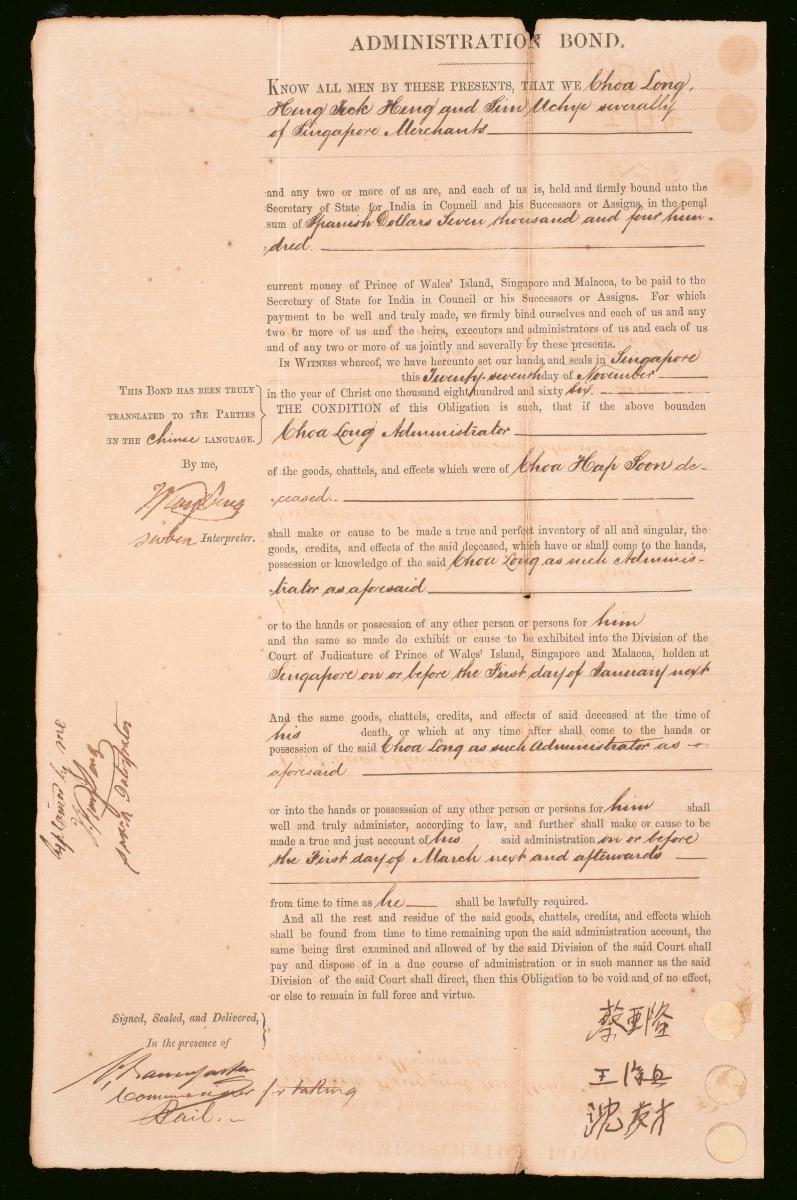 This is a set of documents concerning the administration of the estate of Choa Hap Soon. It is part of a collection of legal documents from the 19th and early 20th centuries which provides a glimpse into the work of the notable personalities who left their mark on Singapore’s legal history, and the economic and other transactions undertaken by ordinary immigrants in 19th century Singapore that tell stories of misfortune and indebtedness which would otherwise have disappeared from history.
