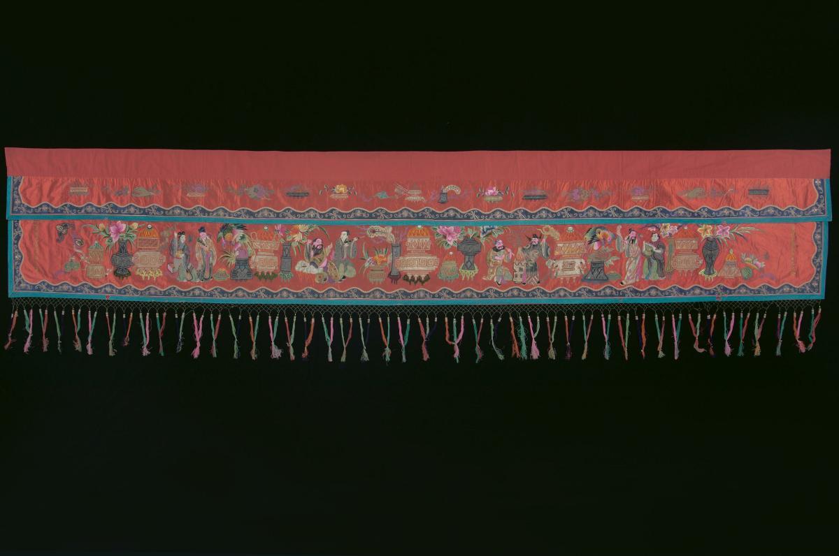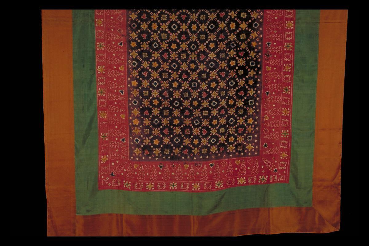 The centre of this cotton wall-hanging has an indigo-blue supplementary pattern with concentric lozenges containing hooks and smaller diamonds. Other bands contain diamond motifs woven in red, green and black. The bands are also formed by weft yarns of red and black. Such cloths are woven by the Tai-Lue who live in Northern Thailand, for use as a domestic altar ritual cloth.