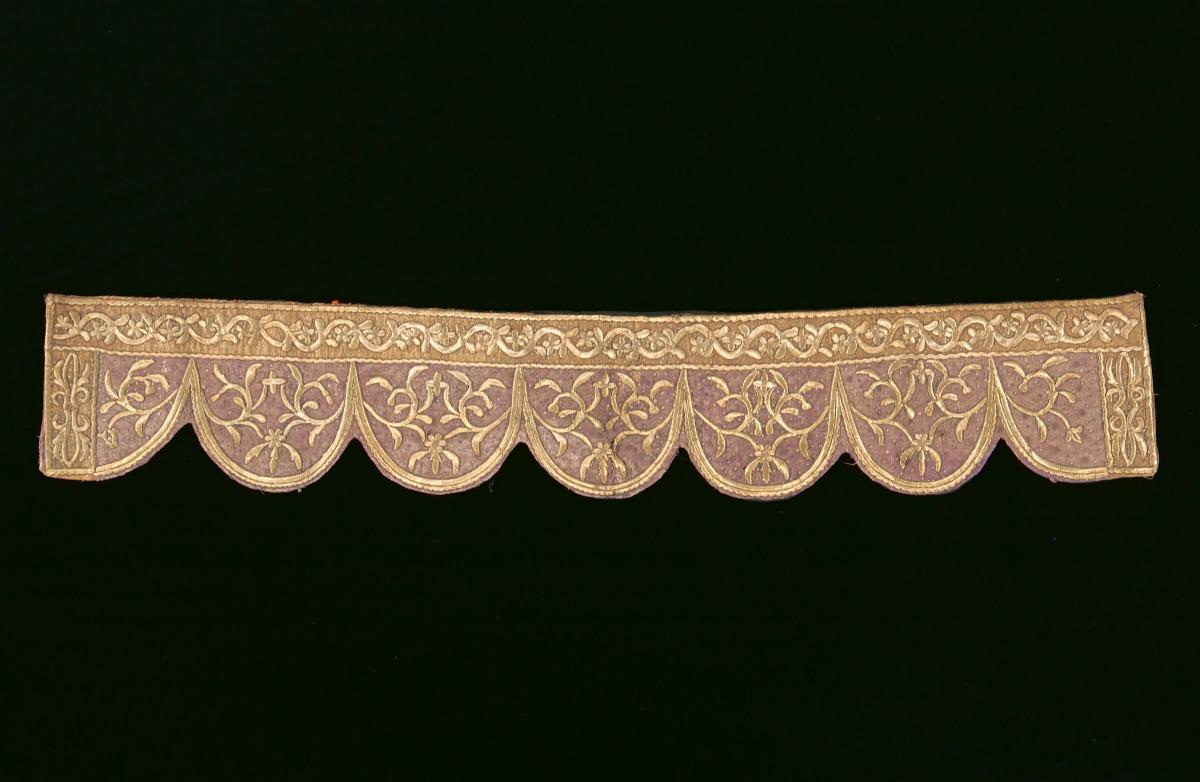 This red tapestry made of silk has gold and coloured thread embroidery. The top panel has motifs of vase, potted flowers, peach, fingered citron (also known as Buddha's hand citron) and josstick burner in gold, silver and coloured thread embroidery. It is edged with scalloped blue silk border comprising gold, green and pink thread embroidery. A yellow knotted fringe appears at the lower hem. The bottom panel has two panels with gold and coloured thread embroidery with motifs of birds, trees and flowers. Embroidered panels such as this were hung at the door during festive occasions.