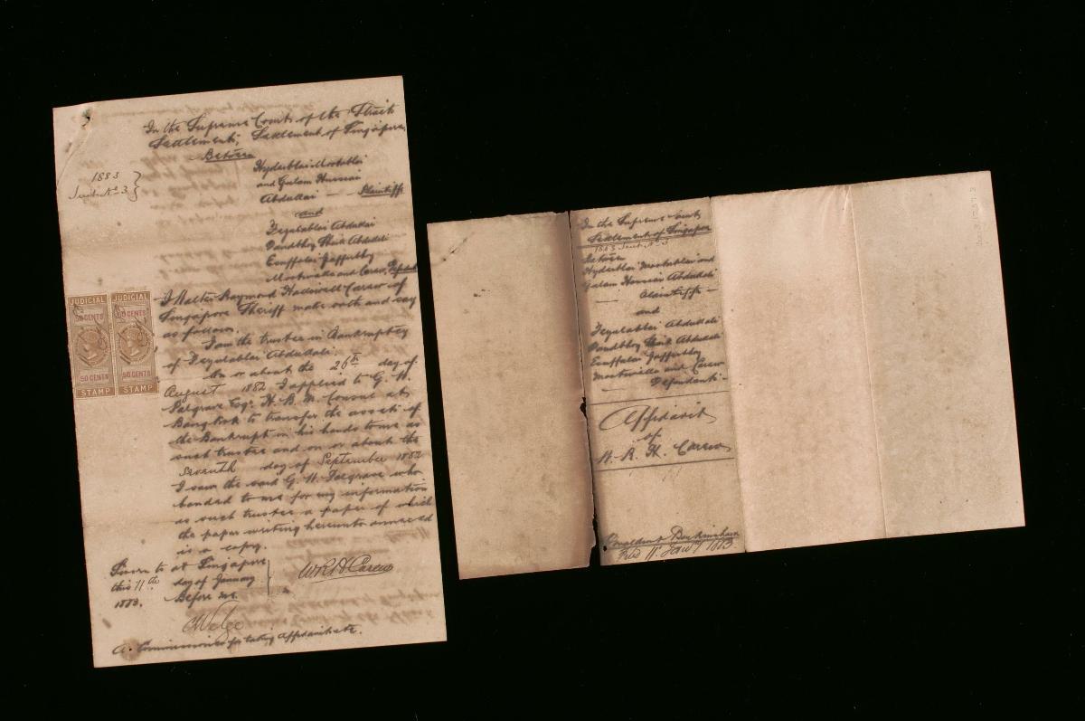 This is the affidavit of Pua Guan Heng and Pua Soon Lie of Singapore made on 14 August 1885 concerning the administration of the estate of the deceased Pua Boon Liang. It is part of a collection of legal documents from the 19th and early 20th centuries which provides a glimpse into the work of the notable personalities who left their mark on Singapore’s legal history, and the economic and other transactions undertaken by ordinary immigrants in 19th century Singapore that tell stories of misfortune and indebtedness which would otherwise have disappeared from history.