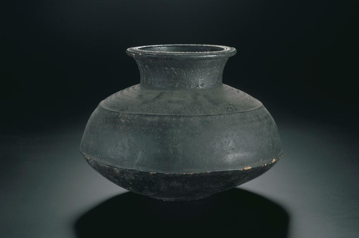This black earthenware water pot is also known as a 'kendi'. It has incised circular lines on the body and neck, and an onion-shaped mouth.Kendi is a Malay term derived from the Sanskrit word ‘kundika’, a small ritual pouring vessel. A typical kendi has a bulbous body, a neck which is used for holding the vessel and a spout. The tradition of using kendi in Hindu-Buddhist rituals suggests that this type of vessel originated from India. Kendi have been used in Southeast Asia for at least a thousand years, as indicated by depictions on temple wall reliefs dating back to 9th century CE. They include locally made earthenware kendi as well as glazed wares from China, Japan, Thailand and Vietnam. These were part of the lively international trade in ceramics and other commodities that resulted in stylistic exchanges. Kendi were used for a wide range of purposes in addition to their primary function as a pouring and drinking container. In Southeast Asia, kendi were important as ritual pouring vessels used in weddings and other ceremonies. Miniature kendi were likely to have been medicine containers or toys. The West Asian tradition of tobacco smoking using water-pipes was also practiced in this region and kendi were adapted for this purpose.