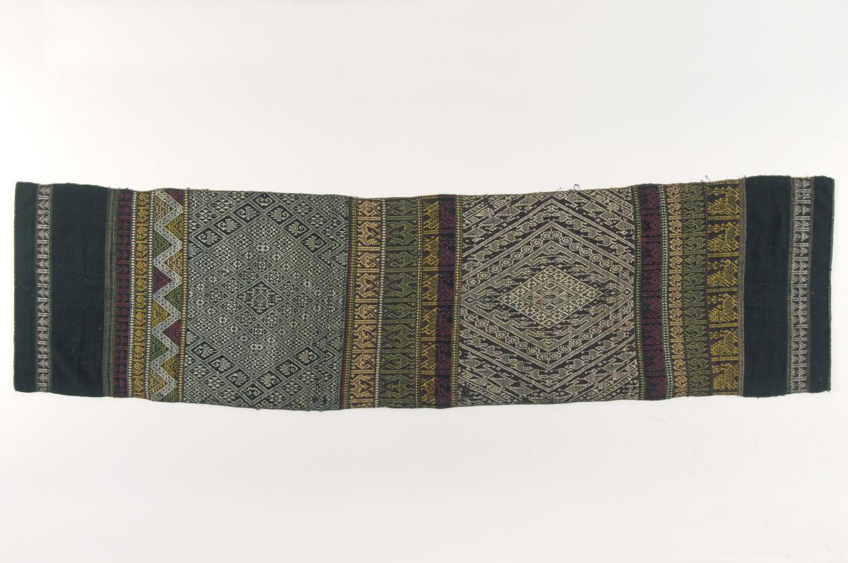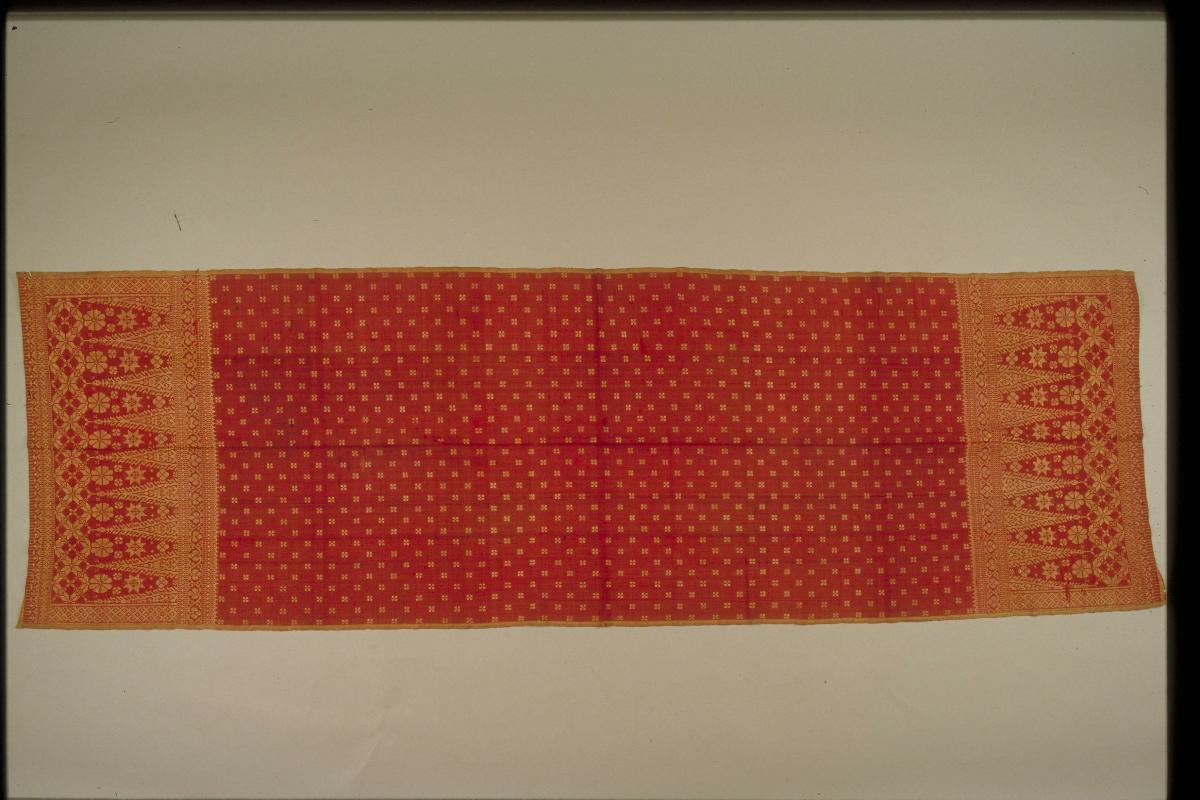 This cloth was made with the ikat technique. This is a single ikat, only the horizontal threads (weft) were dyed in bundles before weaving. They were then woven into the vertical (warp) threads on the loom, carefully aligning them to create the pattern. The finished cloth was then embroidered with metal threads. The design of foliate motifs shows the influence of Indian patola (double ikat) trade cloths from Gujarat.