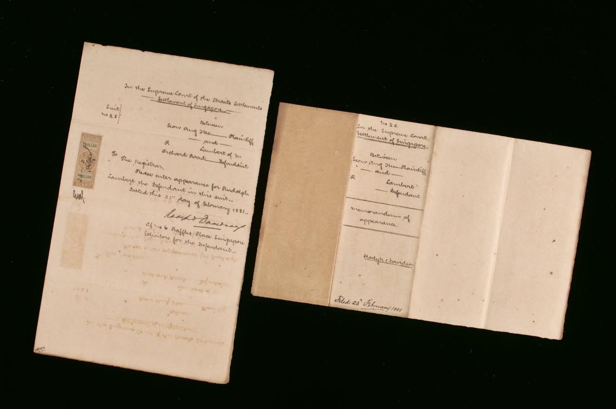 This is a document issued on 1 March 1881 concerning the suit between Seow Ang Hee (plaintiff) and R. Lambert (defendant). It is part of a collection of legal documents from the 19th and early 20th centuries which provides a glimpse into the work of the notable personalities who left their mark on Singapore’s legal history, and the economic and other transactions undertaken by ordinary immigrants in 19th century Singapore that tell stories of misfortune and indebtedness which would otherwise have disappeared from history.