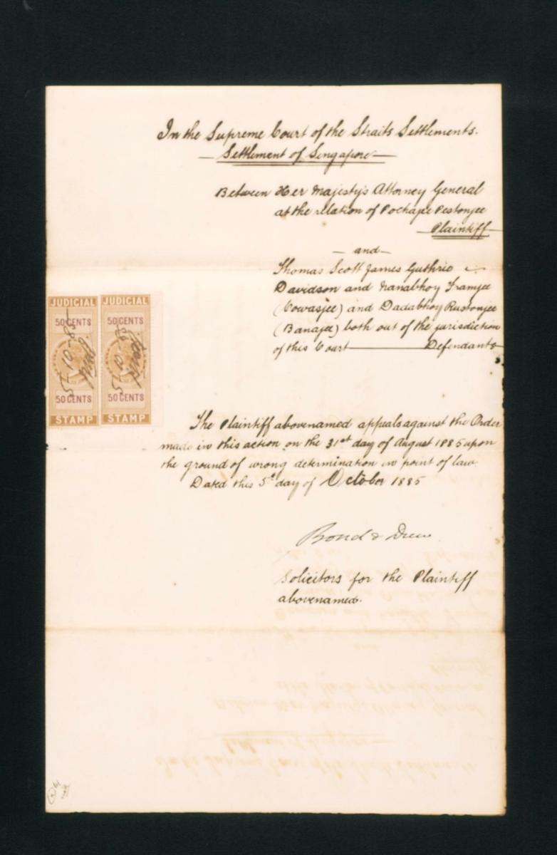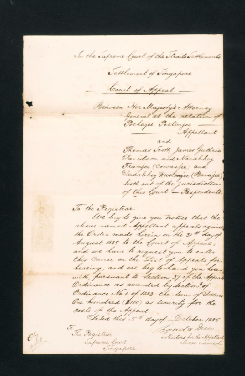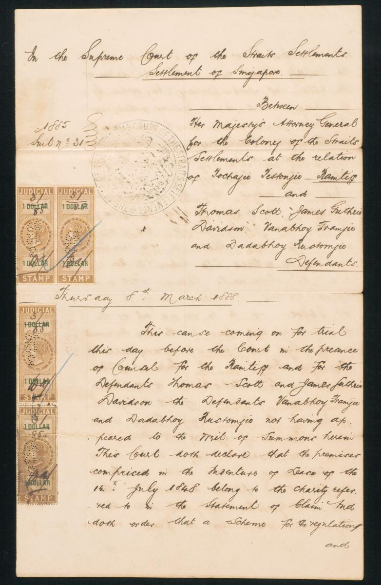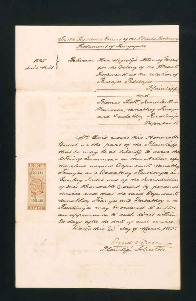 This is a statement of claim issued on 9 July 1885 concerning the suit between the Attorney General at the relation of Pochajee Pestorjee (plaintiff) and Thomas Scott, James Guthrie Davidson, Vomabhoy Bamjee and Dadabhoy Rustomjee (defendants). The last two defendants were out of the jurisdiction of the Supreme Court of the Straits Settlements. This document is part of a collection of legal documents from the 19th and early 20th centuries which provides a glimpse into the work of the notable personalities who left their mark on Singapore’s legal history, and the economic and other transactions undertaken by ordinary immigrants in 19th century Singapore that tell stories of misfortune and indebtedness which would otherwise have disappeared from history.