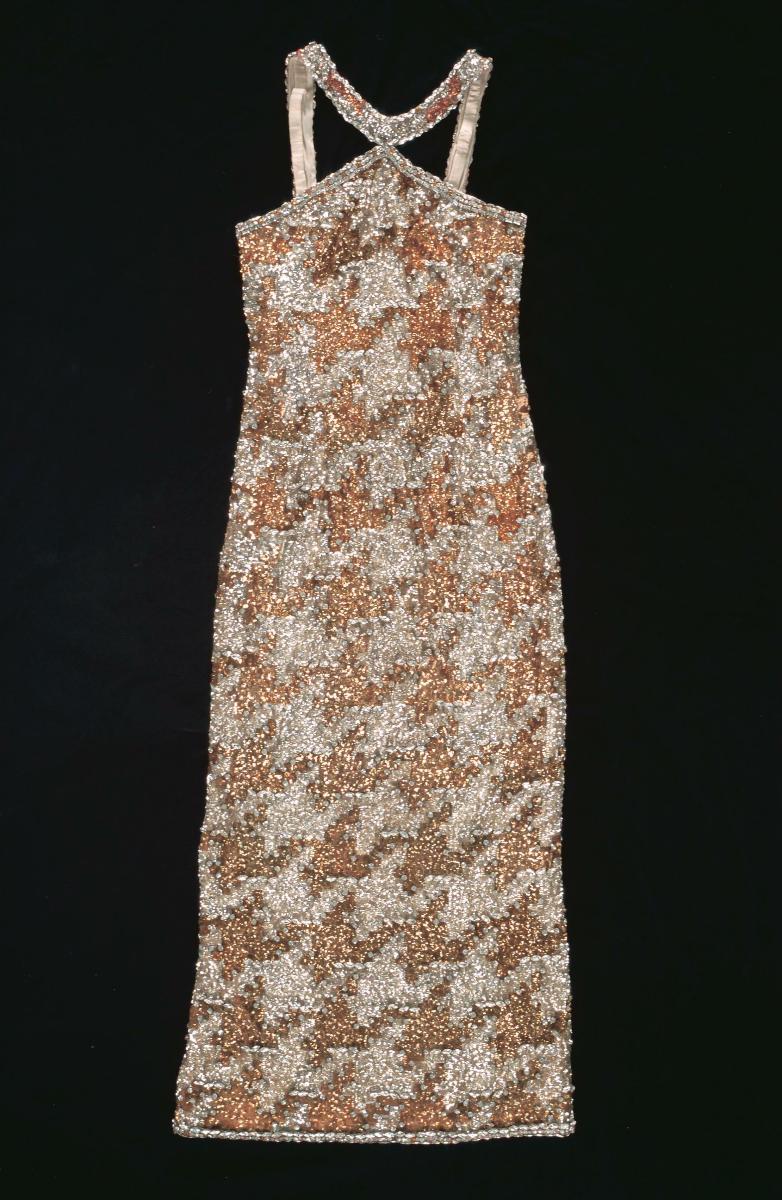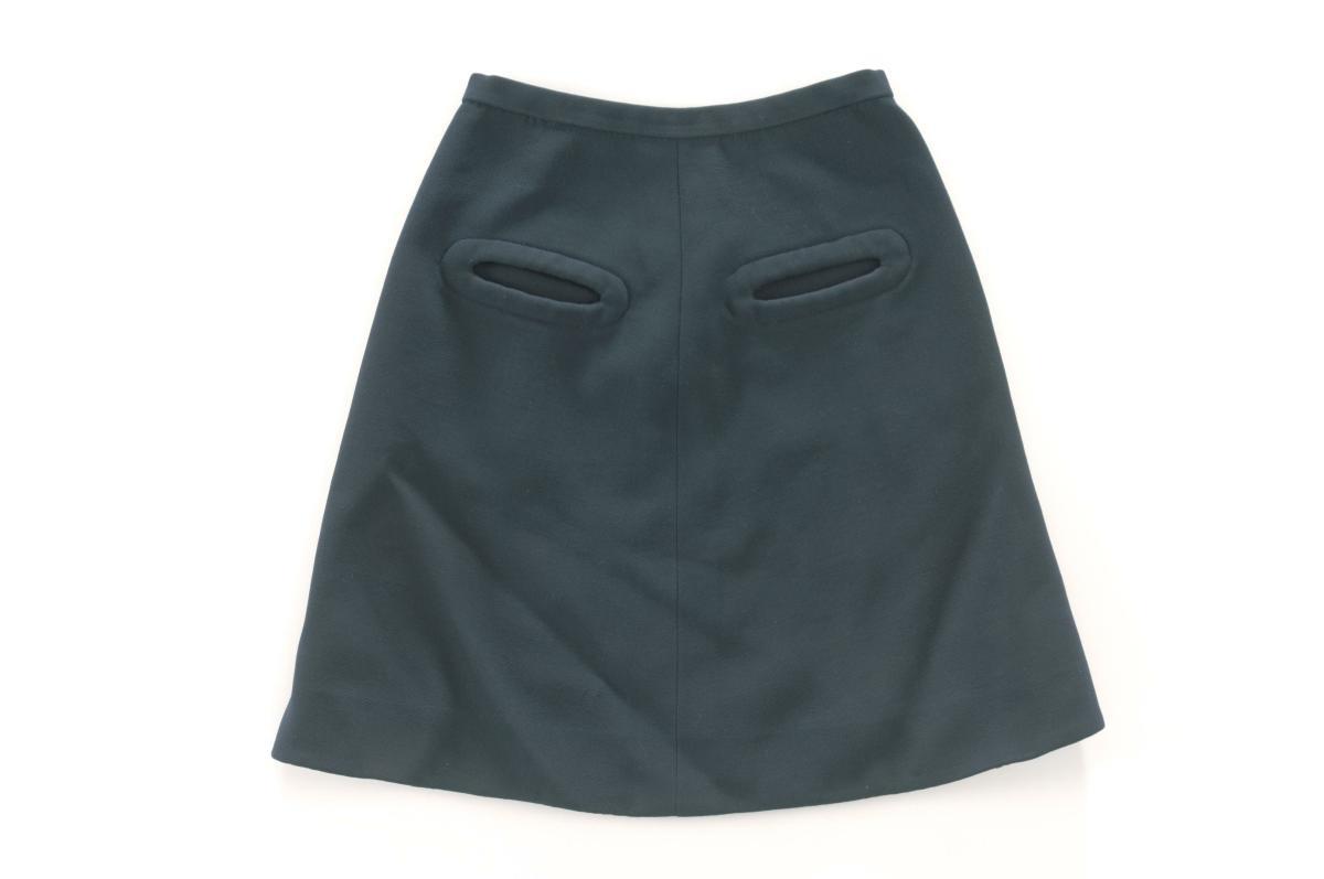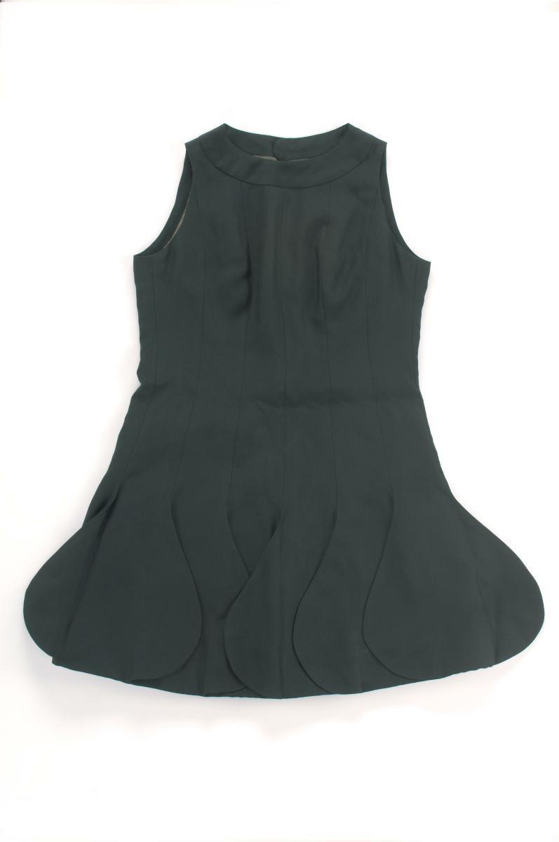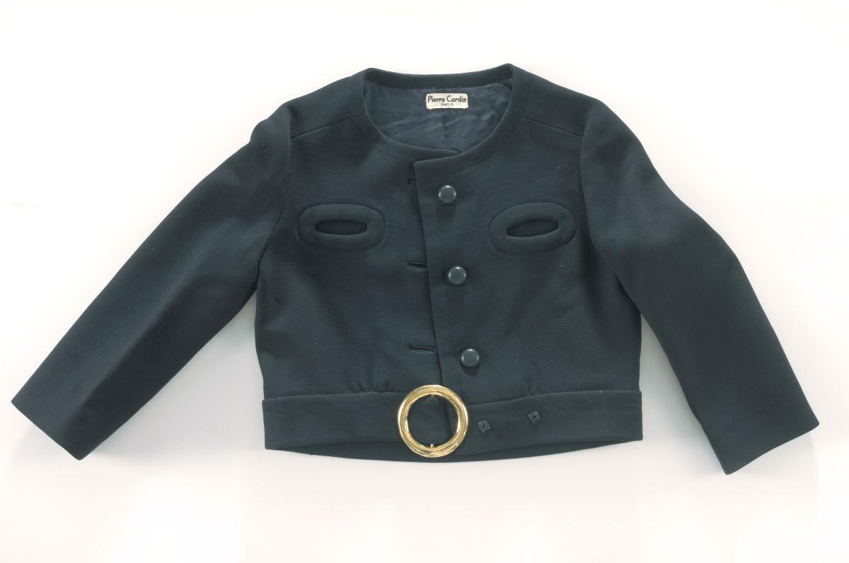 This navy blue ensemble comprises of a jacket with elliptical pockets and a large gilt circle buckle, and a matching A-line skirt. Designer Pierre Cardin was born in 1922 near Venice in Italy but was of French parentage. His parents relocated to the Loire region of France in 1926, where Cardin spent his growing years. At the age of 17, he left home and apprenticed with a tailor in Vichy. Following the end of the Second World War in 1945, Cardin found work at the established fashion houses of Paquin and Schiaparelli in Paris. He became acquainted with painter and set designer Christian Berard and ended up designing the costumes for Jean Cocteau’s staging of ‘Beauty and the Beast’ in 1947. With the support of Christian Dior, Cardin opened his own costume tailoring business in 1949 and subsequently shifted to couture design. His women’s collection made its debut in 1957. Known for designing pieces that were characterised by bold structures and irregular forms, he introduced the balloon dress in the late 1950s, geometrically blocked shifts in the 1960s and hooped dresses in the 1980s. A savvy entrepreneur, Cardin diversified from his fashion line and grew a business empire consisting of a wide range of merchandises bearing his name.