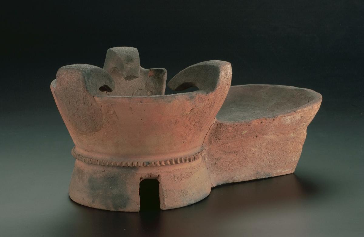 This green lead-glazed model stove served as a burial ware or ‘mingqi’. It is U-shaped with a flat top and three circular openings. On the flat side of the stove is a rectangular opening for stoking purposes. The practice of burying objects with the deceased stems from the belief in life after death. Burying the stove ensured that the deceased could continue ‘life’ in the underworld and served as a proof of his or her identity to underworld officials. Elaborate groups of burial wares were also a display of wealth and social status.