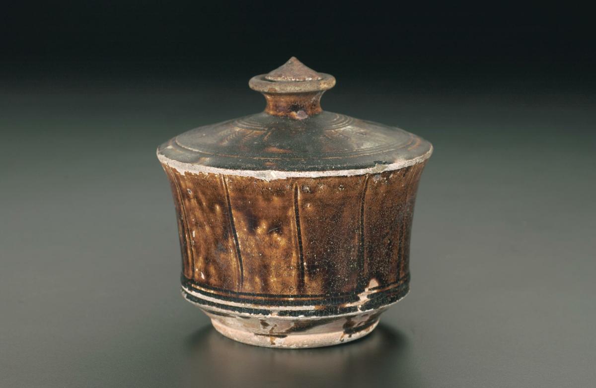 This lime pot of rounded form has an applied bird head and tail, incised decorations on its body and a tiered lid with lotus bud. It is covered with brown glaze that falls short of the foot. This bird-shaped pot was made likely as a general representation of the numerous bird species in the Khmer kingdom. The presence of limepots in Khmer ware indicates the tradition of chewing betel nut.