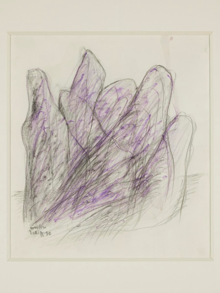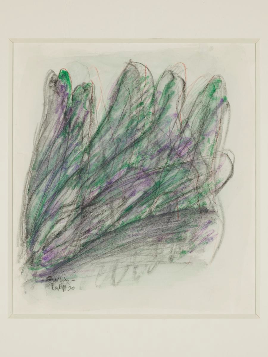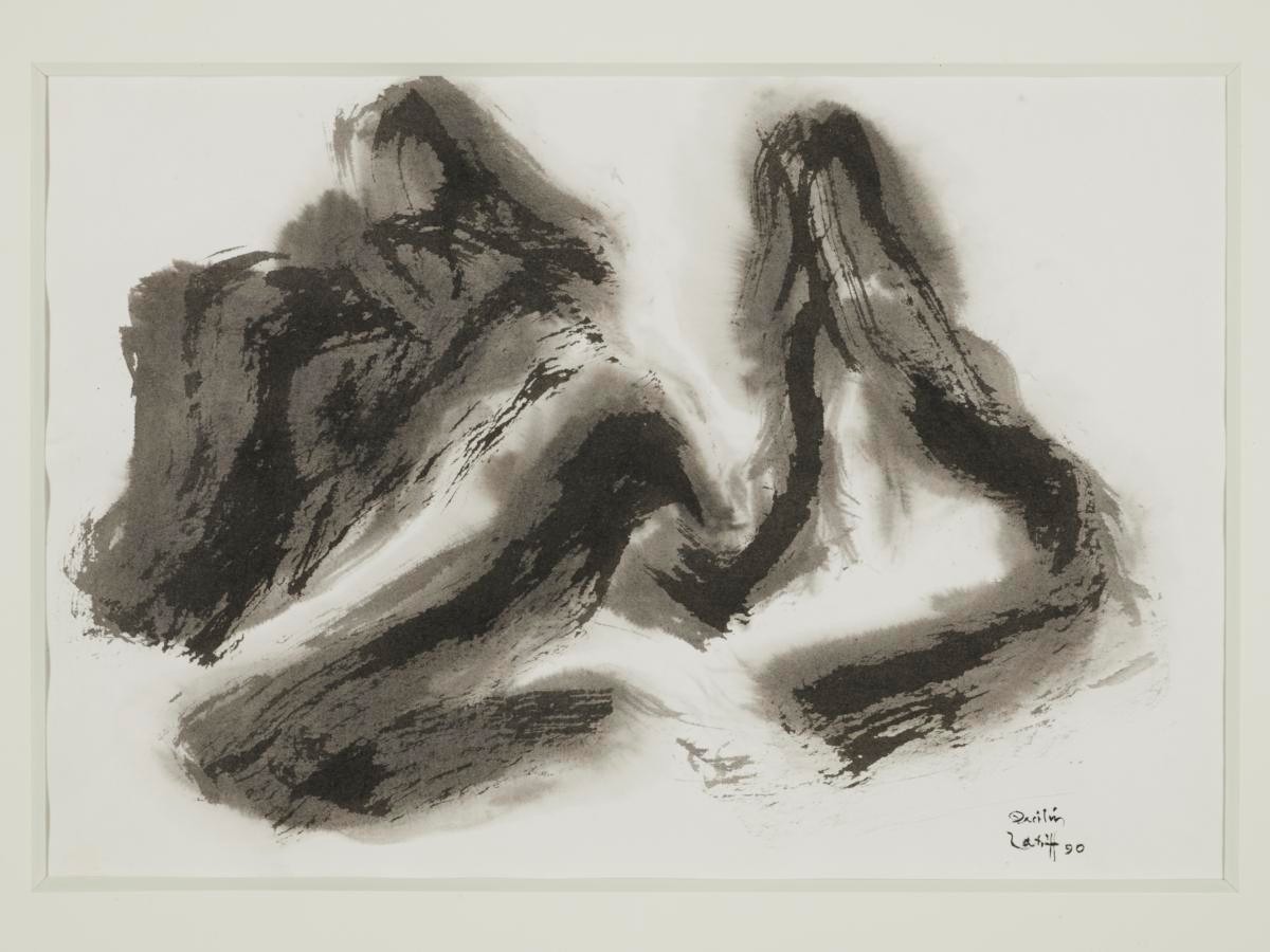 Latiff Mohidin, born in Negeri Sembilan, Malaysia in 1941 completed his primary education in Singapore. While in Singapore, at an early age, Latiff’s precocity in understanding paintings earned him the nickname, ‘Wonder Boy’. From 1960-1964, Latiff studied art at Hochschule fur Bildende Kunste in Berlin, Germany and did brief residencies in Paris and New York. Inspired by his exploration of Southeast Asia in 1964, Latiff has since produced compelling series of artworks – the result of a synthesis between his European experience and the rediscovery of his homeland. He is also a poet who has published several volumes of poetry. The Guilin series stems from Latiff’s brief sojourn in China. ‘Guilin (10)’, executed in the dry brush technique that leaves overlapping textural marks, depicts mountains leaning laterally towards the top edge of the paper. There is a similar painting, ‘Guilin (6)’, albeit in green.