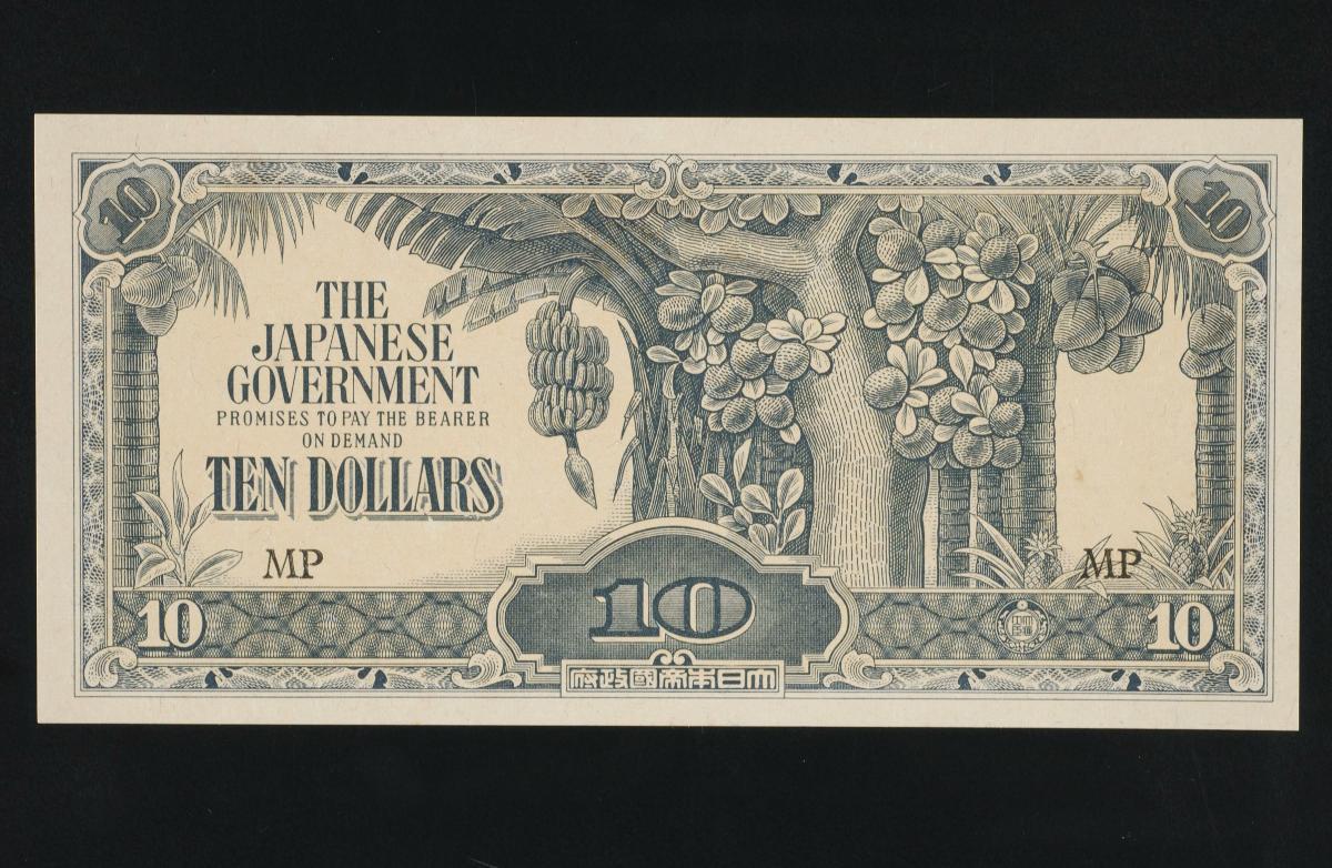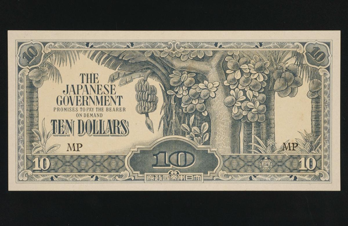 Japanese invasion money (JIM) was paper money used by the Japanese to establish economic control in occupied areas during World War Two. Blocks or code letters (e.g. MA or M/AH) were printed on the paper money for circulation control. The first letter of the code indicates where the money was used. In this case, paper money with blocks starting with the letter ‘M’ was used in Malaya (and Singapore). JIM issued in Malaya was known as ‘banana money’, a term originated from the motif of the banana tree seen on the obverse of this ten dollar note.