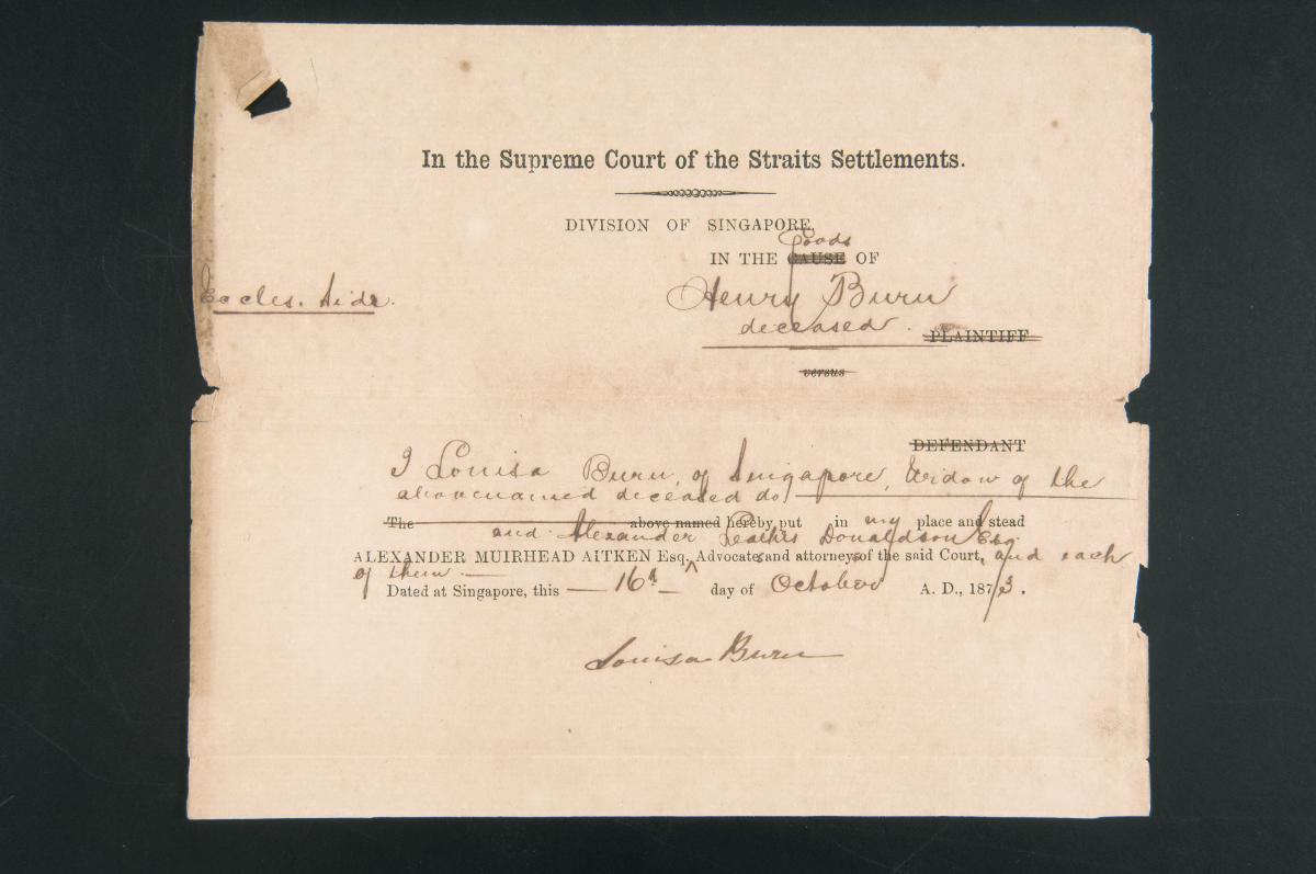 This is the petition of Louisa Belder, the wife of Carl Belder and formerly the widow of John Mark Ottoson, which was filed on 23 November 1874 concerning the administration of Ottoson's estate. It is part of a collection of legal documents from the 19th and early 20th centuries which provides a glimpse into the work of the notable personalities who left their mark on Singapore’s legal history, and the economic and other transactions undertaken by ordinary immigrants in 19th century Singapore that tell stories of misfortune and indebtedness which would otherwise have disappeared from history.