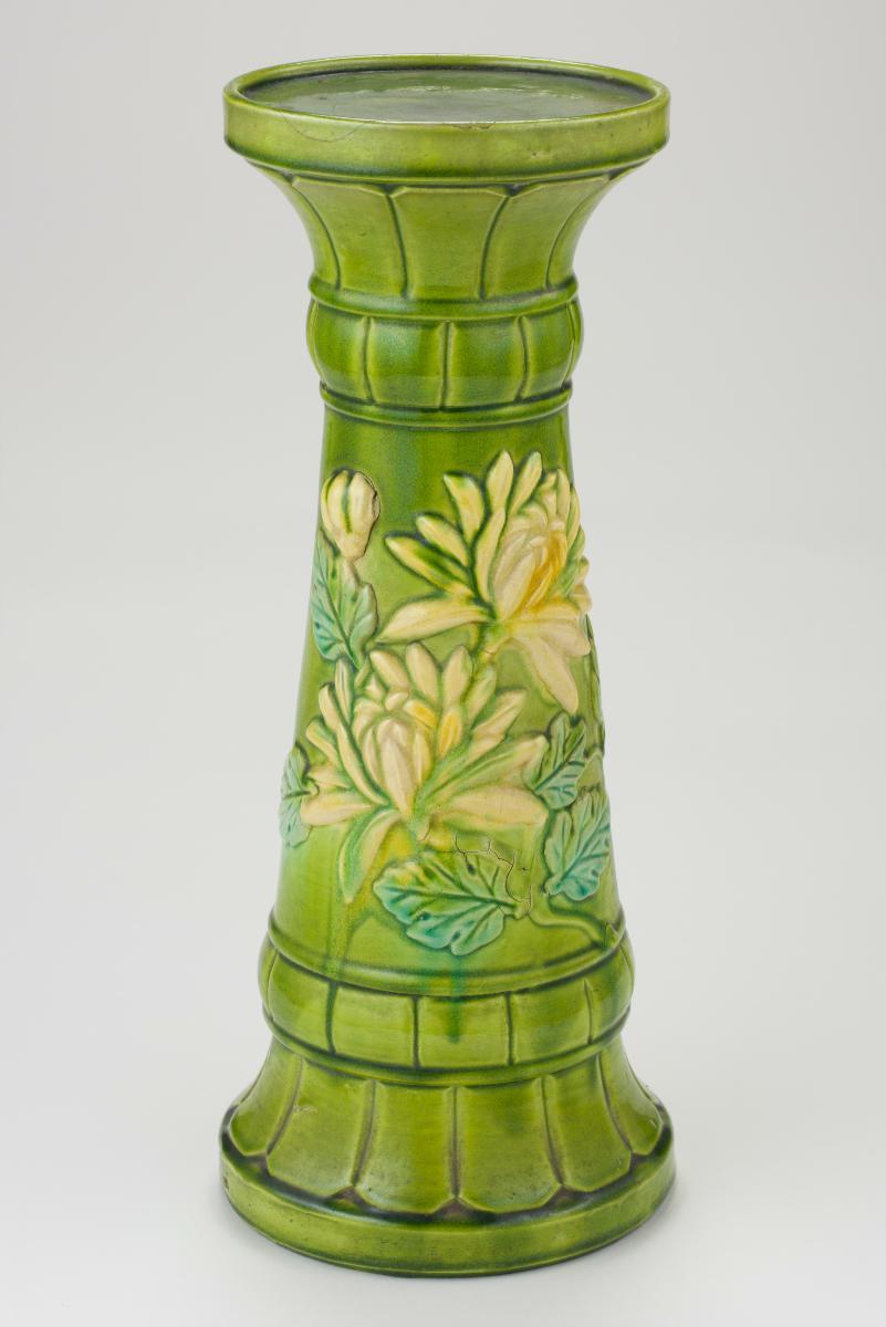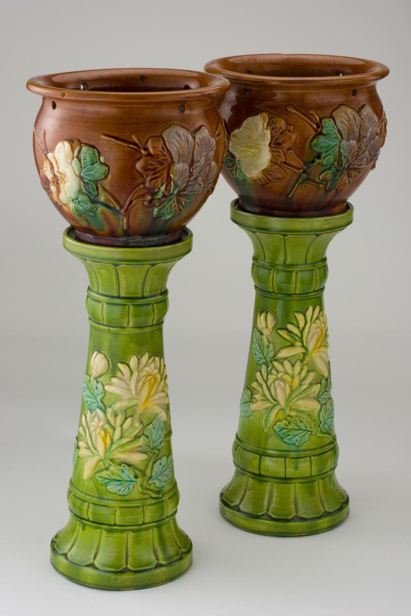 This is a large standing flower pot complete with stand. The main decorative motifs include of purple and white peonies, complete with leaves and stem. Peonies are considered auspicious symbols that represent beauty, love, romance, spring and good fortune. Such pots were probably made in China and shipped to their Peranakan Chinese customers. These were placed around the Peranakan household as decoration. The Peranakan Chinese were fond of purchasing household objects from a variety of sources. Many families used similar items in their kitchens as these were often sold by similar hawkers, who sought out wealthy Peranakan ladies to ply their imported wares.