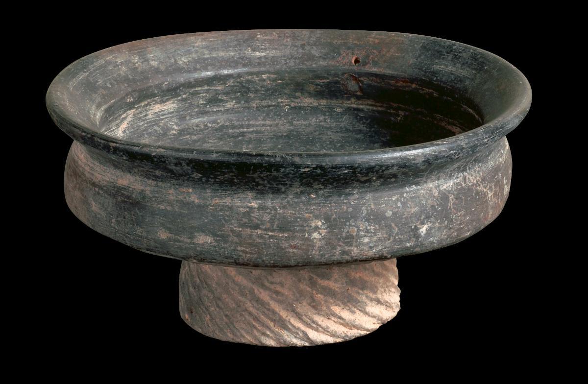 This brown-glazed stem-dish has a flared rim and is decorated on the exterior with vertically incised grooves. The piece was made in Si Satchanalai, one of the twin royal cities in the Sukhothai period from the mid 13th to mid 15th century. Kilns in this region were some of the largest ceramic producers in Southeast Asia at this time.