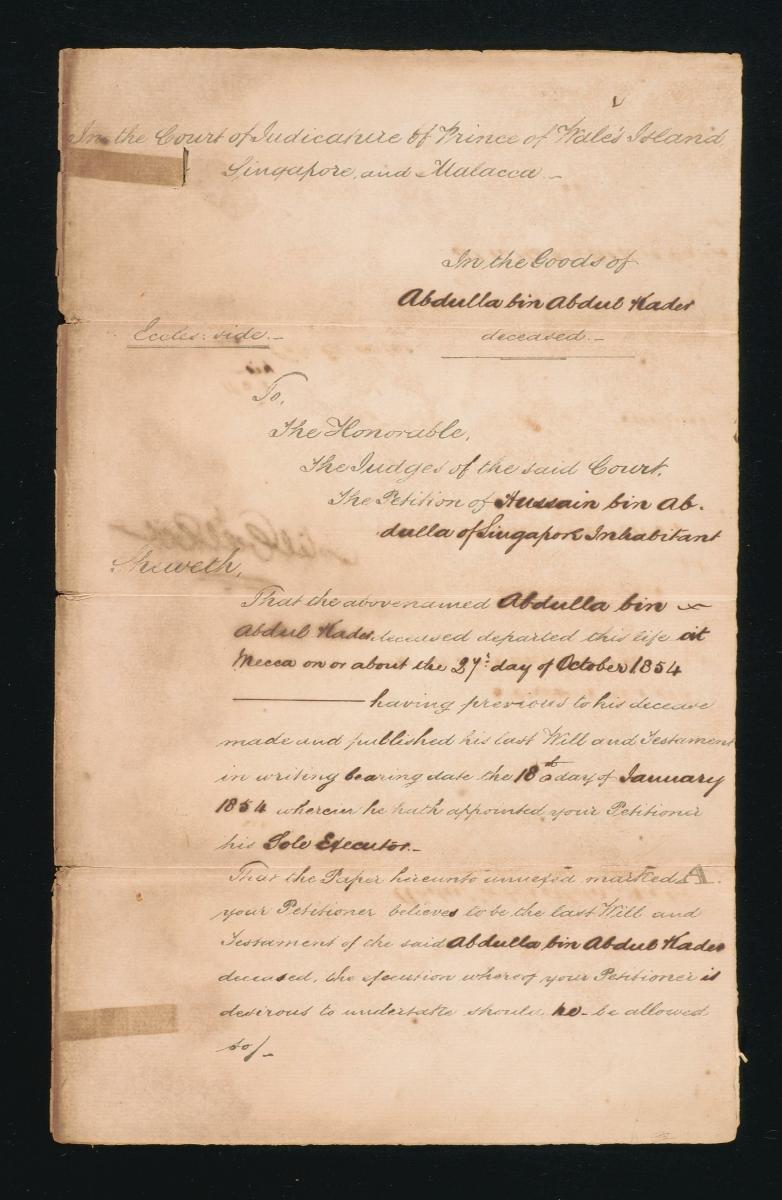 This is a set of documents concerning the administration of the estate of Kader Mesaiboo. It is part of a collection of legal documents from the 19th and early 20th centuries which provides a glimpse into the work of the notable personalities who left their mark on Singapore’s legal history, and the economic and other transactions undertaken by ordinary immigrants in 19th century Singapore that tell stories of misfortune and indebtedness which would otherwise have disappeared from history.