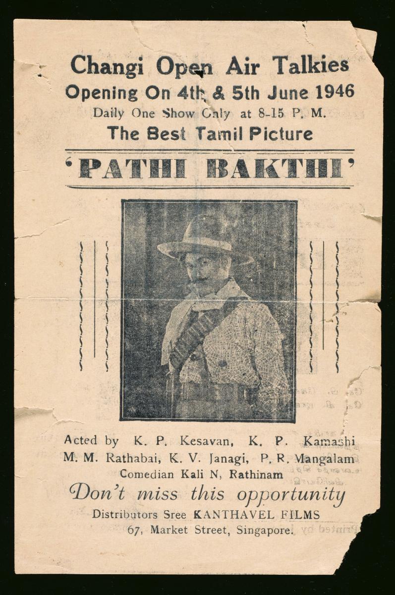 This handbill advertises the opening of the Tamil film ‘Abhimanyu’ on 7 and 8 November 1949 at the Grand Theatre in Parit Buntar, Perak, Malaysia. The handbill is double-sided and has information in English on one side and Tamil on the other. It was printed by Muslim Publishing House Limited, located at Serangoon Road. The film starred U. R. Jeevarathnam and M.R. Santhanalakshmi.
