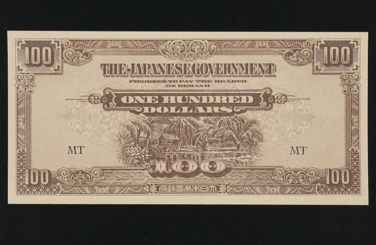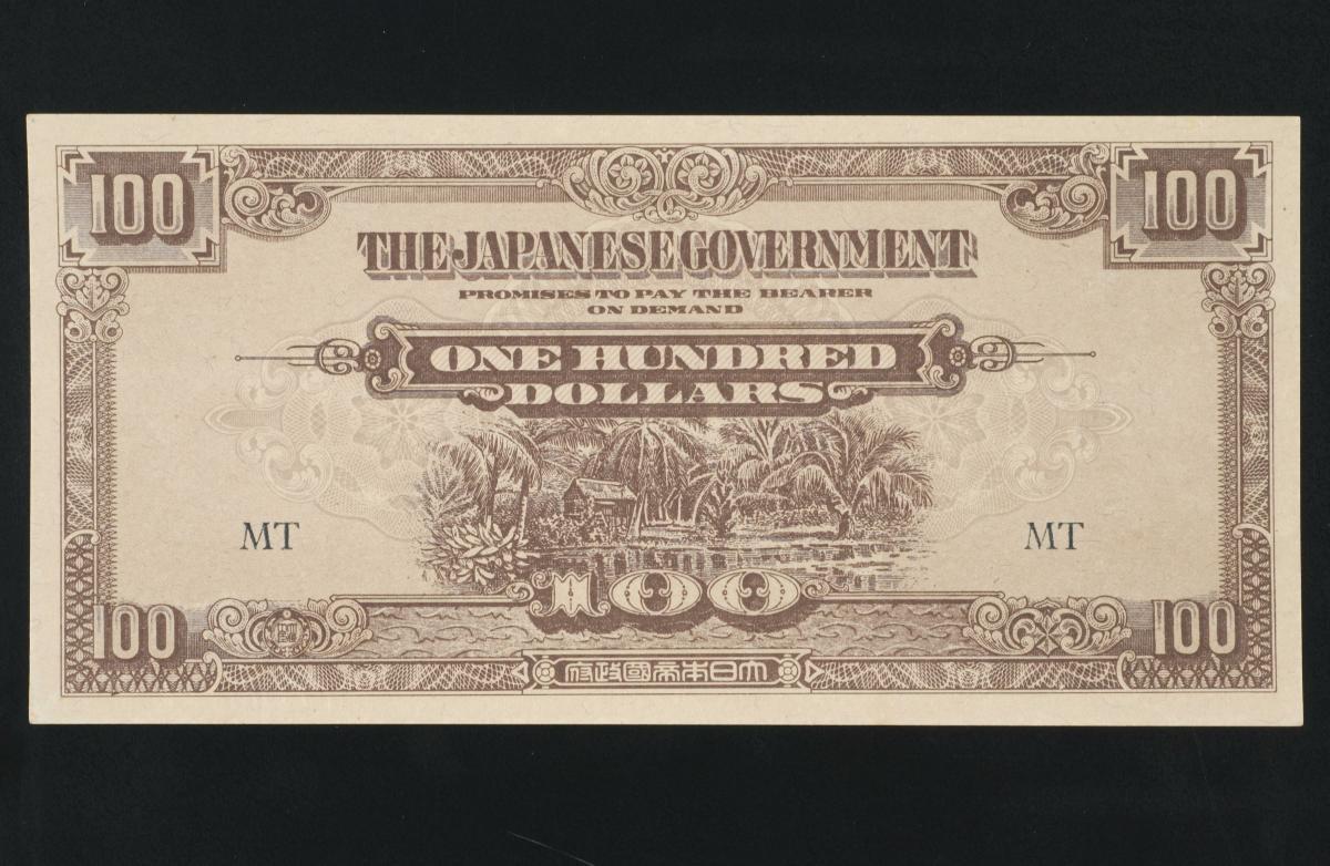 Japanese invasion money (JIM) was paper money used by the Japanese to establish economic control in occupied areas during World War Two. Blocks or code letters (e.g. MA or M/AH) were printed on the paper money for circulation control. The first letter of the code indicates where the money was used. In this case, paper money with blocks starting with the letter ‘M’ was used in Malaya (and Singapore). JIM issued in Malaya was known as ‘banana money’, a term originated from the motif of the banana tree on the obverse of the ten dollar notes. This one hundred dollar note features a kampong house on the obverse.