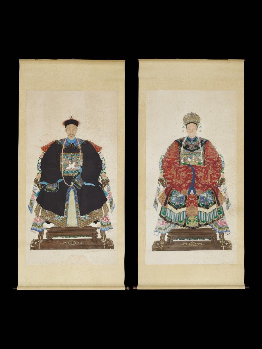 Portraits of father of Mr Shichang as inscribed on the painting. Such ancestral portraits are called qiankun xiang; the male represented heaven (qian) and the female represented the earth (kun). This dichotomy, based on yin-yang theories, defined the parameters of behavior and responsibility of the two sexes. These portraits are hung in lineage halls and in homes during special occasions such as the death anniversaries of the deceased ancestors.