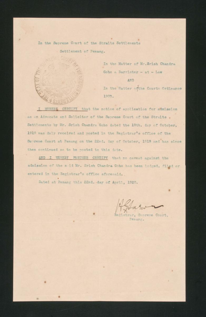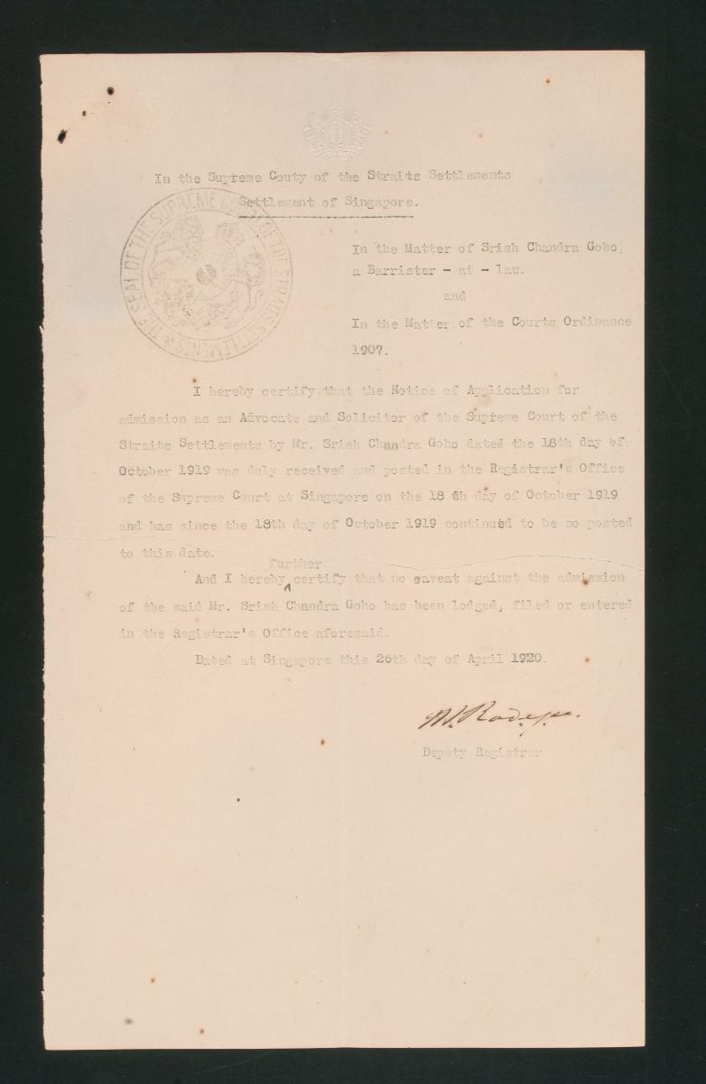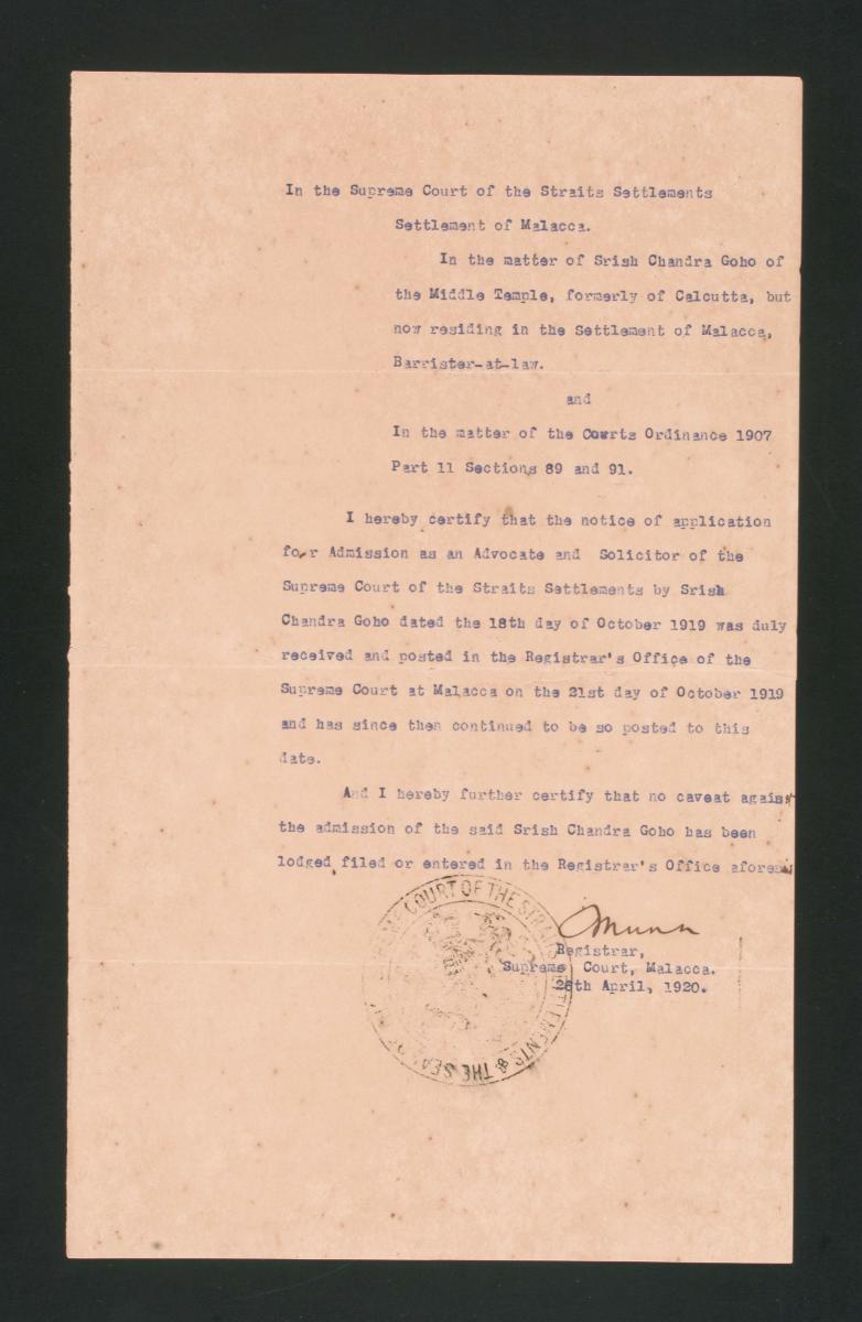 This is a registrar's certificate issued on 26 April 1920 by the Registrar of the Supreme Court of the Straits Settlements in Labuan for Shrish Chandra Goho. It is part of a collection of legal documents from the 19th and early 20th centuries which provides a glimpse into the work of the notable personalities who left their mark on Singapore’s legal history, and the economic and other transactions undertaken by ordinary immigrants in 19th century Singapore that tell stories of misfortune and indebtedness which would otherwise have disappeared from history.