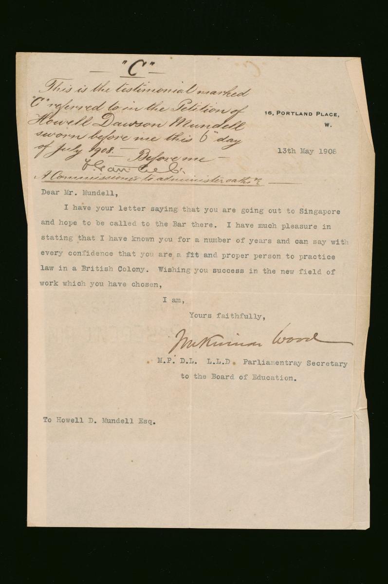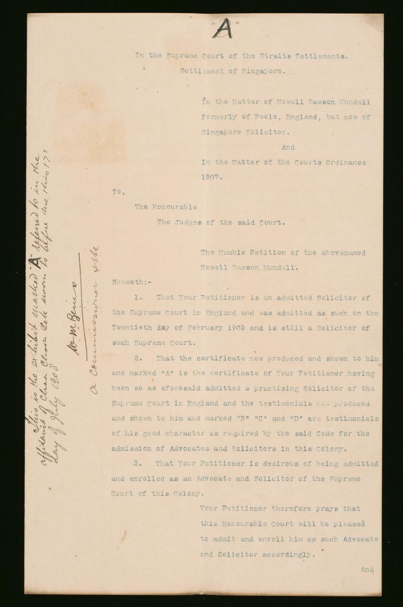 This is a testimonial for Howard Dawson Mundell written on 13 April 1908 from the District Registry of the High Court of Justice and County Court Office, Poole, Dorset, concerning Mundell's petition for admission as a solicitor and advocate to the Supreme Court of the Straits Settlements. It is part of a collection of legal documents from the 19th and early 20th centuries which provides a glimpse into the work of the notable personalities who left their mark on Singapore’s legal history, and the economic and other transactions undertaken by ordinary immigrants in 19th century Singapore that tell stories of misfortune and indebtedness which would otherwise have disappeared from history.