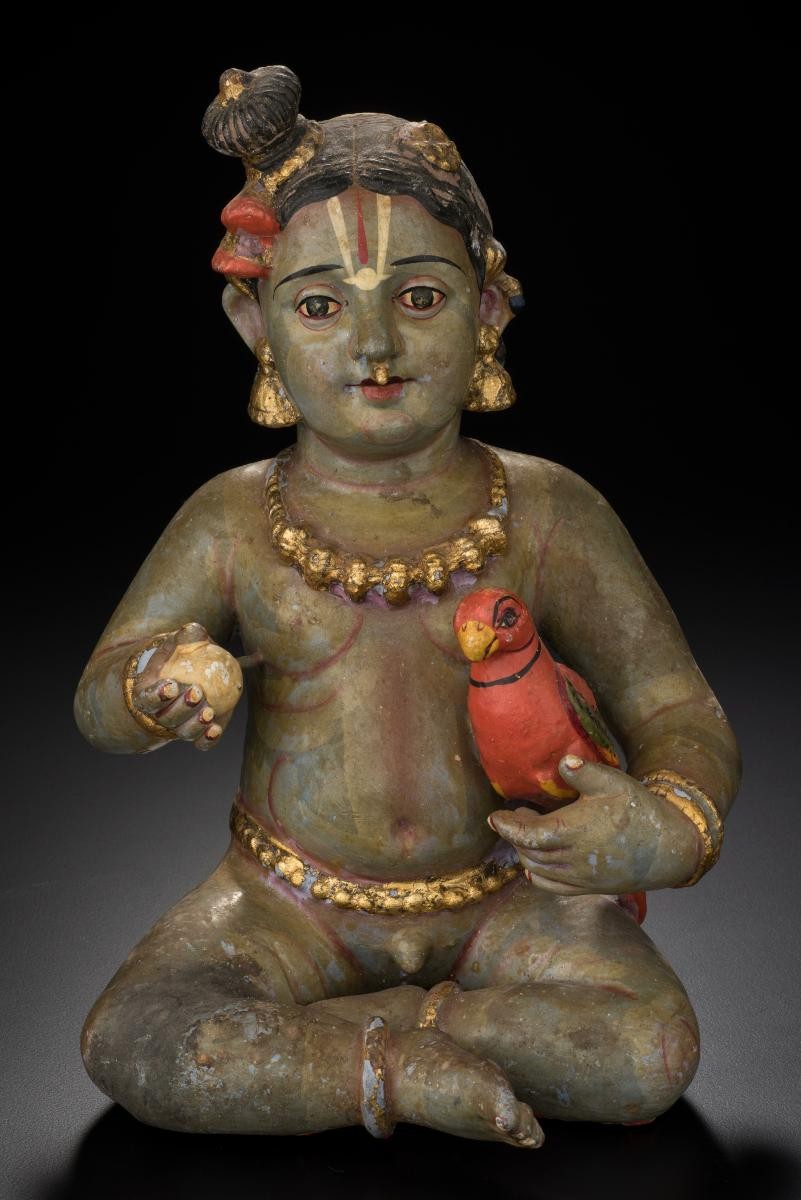 This image is of a crawling image of baby Krishna. Generally addressed as Lalji in north India, it is also called the Navaneeta Krishna. The blue-bodied Krishna wears a crimson patterned red dhoti and is shown here holding a butter ball. In this rendition, Krishna is depicted highly bejeweled and with well-rounded proportions. This painting is believed to come from Andhra Pradesh or Karnataka as the proportions and treatment of rounded volume suggests.
