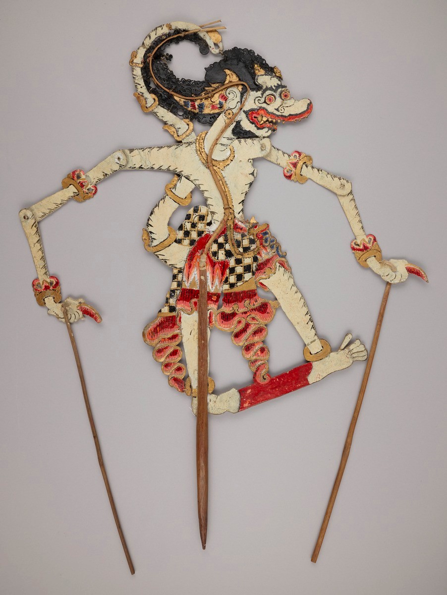 This shadow puppet of Hanuman is also known as 'Veera Anjaneya' in south India. Hanuman is the monkey hero from the 'Ramayana' and is depicted here with the 'namam' (Vaishnava forehead mark). He is wearing elaborate jewels, garlands and headgear on a warrior’s physique with detachable arms, legs and a tail. This puppet is perforated with floral motif all over which when seen against light casts a beautiful shadow with patterned light. Hanuman is a highly revered celibate deity in India, while in Thailand he is a womaniser and has numerous love affairs with women of the earth, the heaven and the seas. He is one of the main characters from the Ramayana and is important in the pantheon of Hindu gods.This form of shadow puppetry is known as Tholubomalatta in Tamil Nadu and Andhra Pradesh. The puppets of Andhra Pradesh are unique in that they are created in a combination of profile and frontal views, as seen in this Hanuman where the legs and head point to the side in a profile view while the rest of the body is presented in a frontal view.