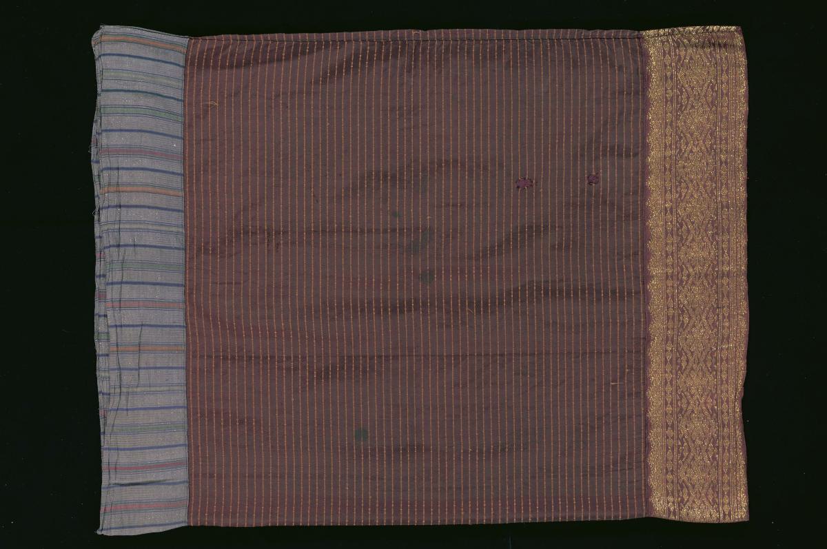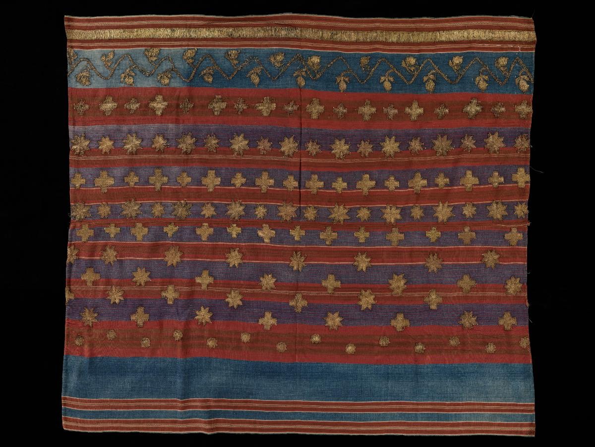 This narrow tubular skirt is woven in the traditional composition which consists of a broad band, situated at the lower part of the skirt and feline animals resembling European coat of arms. The upper register of the skirt is black woven with bright but thin stripes in polychrome trade yarns.