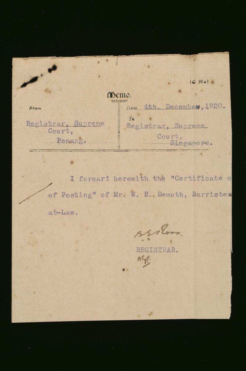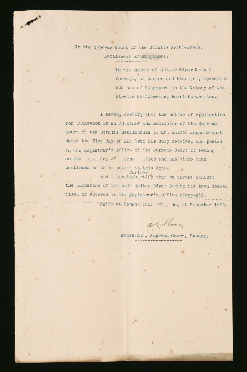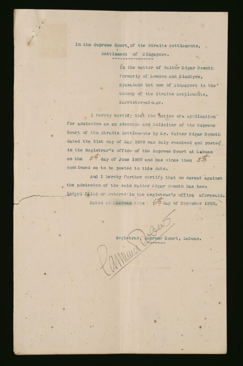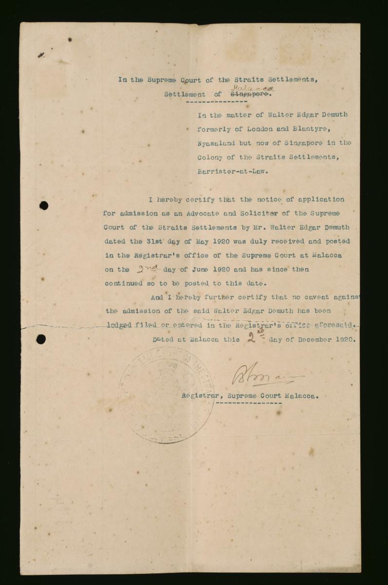 This is a registrar's certificate issued on 3 December 1920 by the Registrar of the Supreme Court of the Straits Settlements in Singapore for Walter Edgar Demuth. It is part of a collection of legal documents from the 19th and early 20th centuries which provides a glimpse into the work of the notable personalities who left their mark on Singapore’s legal history, and the economic and other transactions undertaken by ordinary immigrants in 19th century Singapore that tell stories of misfortune and indebtedness which would otherwise have disappeared from history.
