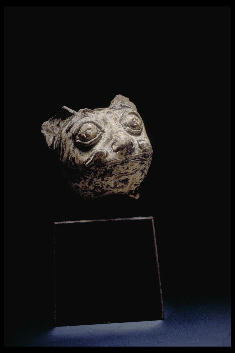 This green-glazed head was probably part of a larger piece made in the form of a lion. It was made in Si Satchanalai, one of the twin royal cities in the Sukhothai period from the mid 13th to the mid 15th century. Kilns in this region were some of the largest ceramic producers in Southeast Asia at this time.