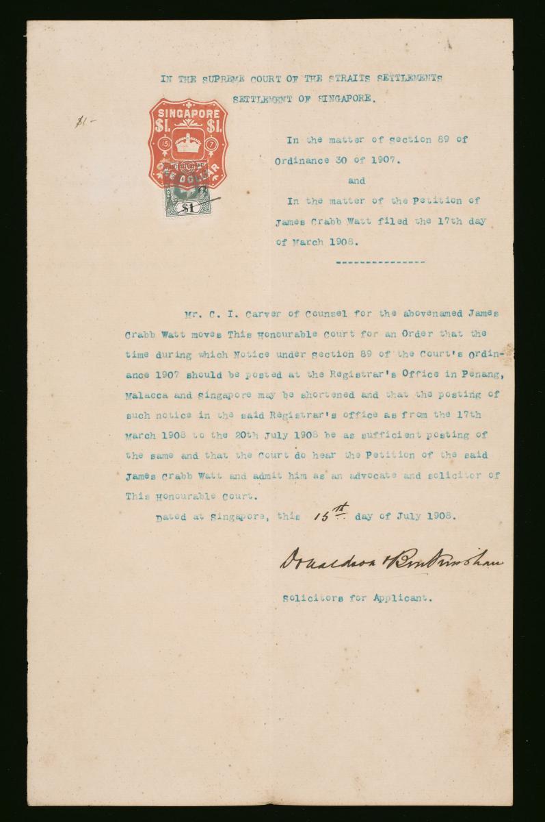 This is an order moved by Mr Upcott of Counsel on 16 April 1914 for Charles William Alan Carpenter, concerning his petition to be admitted a solicitor and advocate to the Supreme Court of the Straits Settlements. It is part of a collection of legal documents from the 19th and early 20th centuries which provides a glimpse into the work of the notable personalities who left their mark on Singapore’s legal history, and the economic and other transactions undertaken by ordinary immigrants in 19th century Singapore that tell stories of misfortune and indebtedness which would otherwise have disappeared from history.