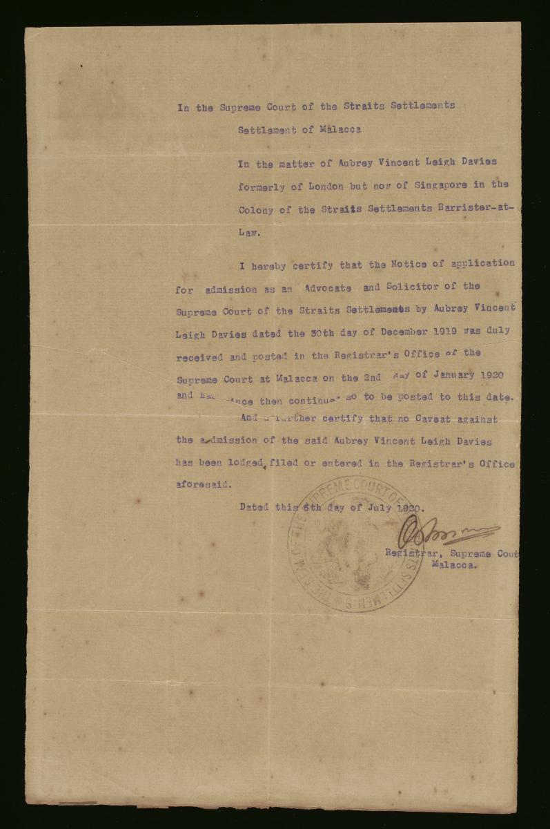 This is a registrar's certificate issued on 26 October 1921 by the Registrar of the Supreme Court of the Straits Settlements in Malacca for William Alford Noël Davies. It is part of a collection of legal documents from the 19th and early 20th centuries which provides a glimpse into the work of the notable personalities who left their mark on Singapore’s legal history, and the economic and other transactions undertaken by ordinary immigrants in 19th century Singapore that tell stories of misfortune and indebtedness which would otherwise have disappeared from history.