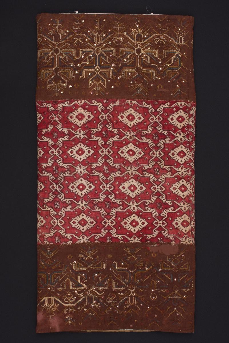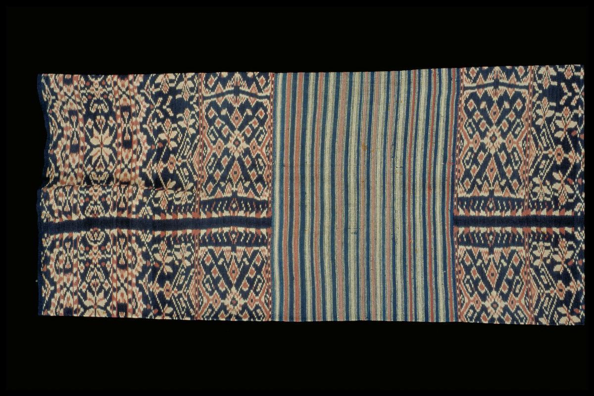 This style is typical of skirts worn in the Haka area of Northern Chin State, a hilly region of west Burma on the border with India. The skirt is known as hni tial, meaning “spotted skirt”, in reference to the scattered diamond patterns. These were made by weaving silk threads horizontally across the skirt – a technique known as supplementary weft weaving. It has been suggested that this particular style of skirt was only worn on special occasions especially by less wealthy women, as the imported cotton from India and silk from China were costly and the processes of natural dyeing and weaving took up much time.