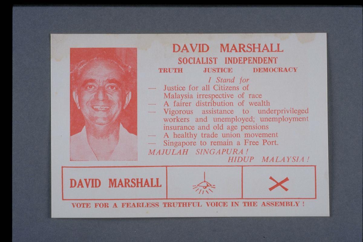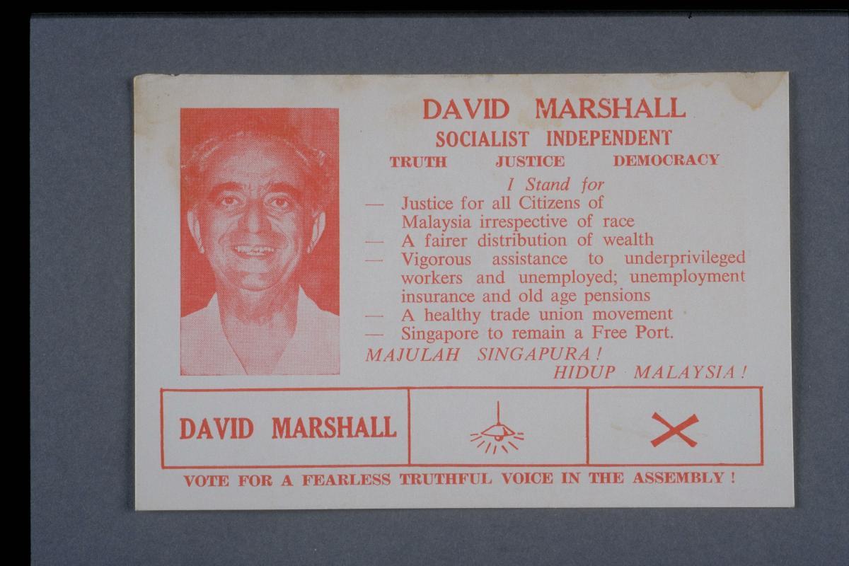 This was the campaign card David Saul Marshall used for the Anson by-election in 1961, which he contested – and won – as President of the Worker’s Party that he founded in 1957. A prominent lawyer and a diplomat, Marshall was Singapore’s first Chief Minister, a position he assumed when the political party he belonged to at the time, the Labour Front, won the general election in 1955. Although he was known for various contributions and ideas that included initiating the meet-the-people sessions and mooting for multilingualism, Marshall’s political career was characterised by his vision for a self-governing and subsequently independent Singapore. As illustrated by the campaign slogan on this card, Marshall was a fervent believer that Singapore should gain ‘merdeka’, or independence, sooner rather than later. Marshall retired from politics after he lost the Anson seat in the 1963 general election, which he stood as an independent candidate. He resumed his legal practice and went on to be Singapore’s Ambassador to France, Portugal and Spain.