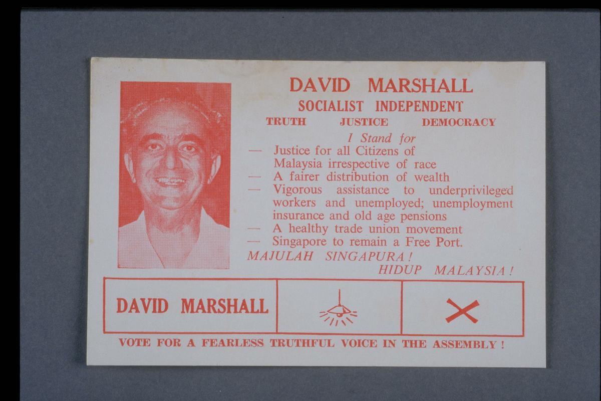 This was the campaign card David Saul Marshall used for the Anson by-election in 1961, which he contested – and won – as President of the Worker’s Party that he founded in 1957. A prominent lawyer and a diplomat, Marshall was Singapore’s first Chief Minister, a position he assumed when the political party he belonged to at the time, the Labour Front, won the general election in 1955. Although he was known for various contributions and ideas that included initiating the meet-the-people sessions and mooting for multilingualism, Marshall’s political career was characterised by his vision for a self-governing and subsequently independent Singapore. As illustrated by the campaign slogan on this card, Marshall was a fervent believer that Singapore should gain ‘merdeka’, or independence, sooner rather than later. Marshall retired from politics after he lost the Anson seat in the 1963 general election, which he stood as an independent candidate. He resumed his legal practice and went on to be Singapore’s Ambassador to France, Portugal and Spain.