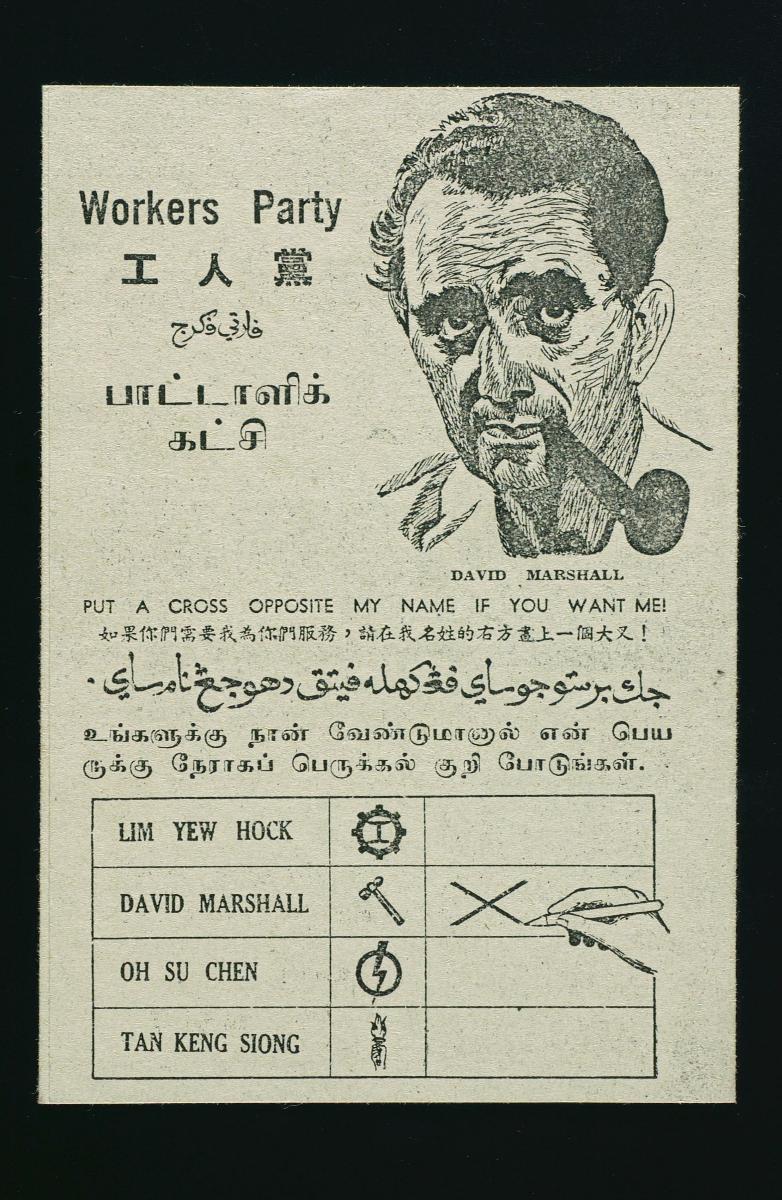 This was the campaign card David Saul Marshall used for the Anson by-election in 1961, which he contested – and won – as President of the Worker’s Party that he founded in 1957. A prominent lawyer and a diplomat, Marshall was Singapore’s first Chief Minister, a position he assumed when the political party he belonged to at the time, the Labour Front, won the general election in 1955. Although he was known for various contributions and ideas that included initiating the meet-the-people sessions and mooting for multilingualism, Marshall’s political career was characterised by his vision for a self-governing and subsequently independent Singapore. As illustrated by the campaign slogan on this card, Marshall was always very vocal about his ideas but above all, he was a fervent believer that Singapore should gain ‘merdeka’, or independence, sooner rather than later.