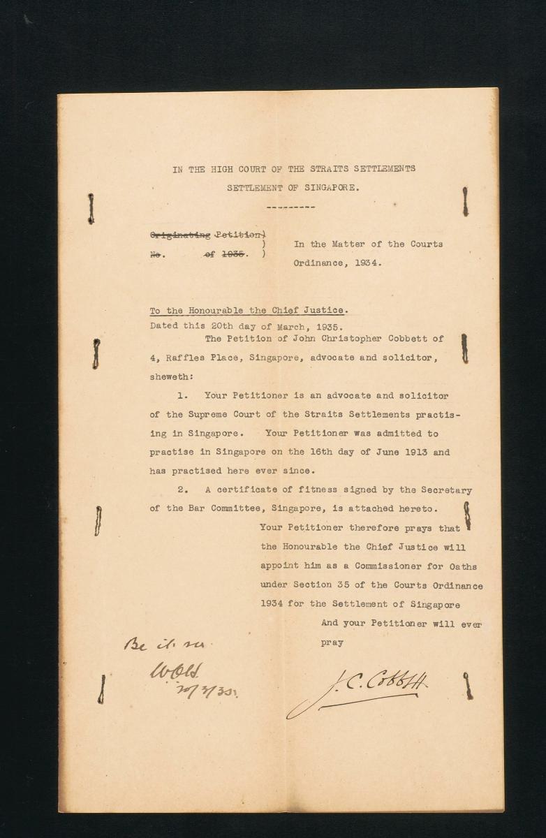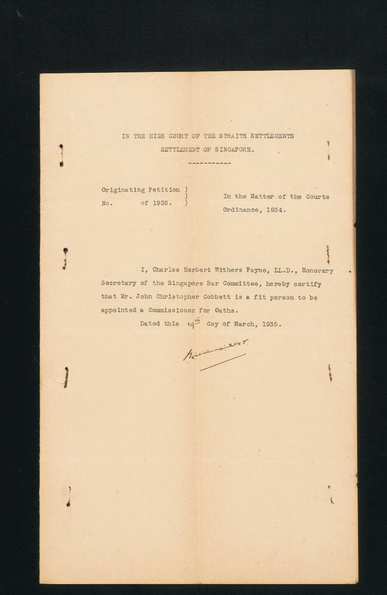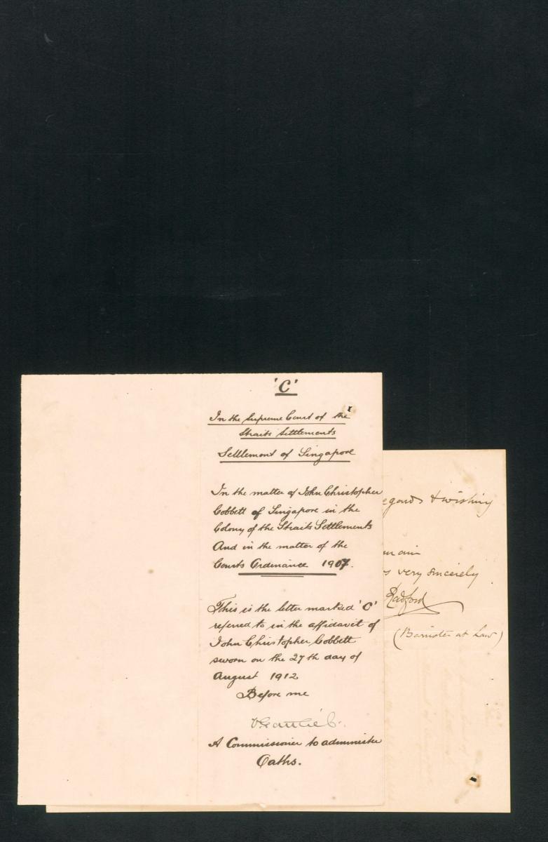 This is a testimonial for John Christopher Cobbett written by E. Radford. It is part of a collection of legal documents from the 19th and early 20th centuries which provides a glimpse into the work of the notable personalities who left their mark on Singapore’s legal history, and the economic and other transactions undertaken by ordinary immigrants in 19th century Singapore that tell stories of misfortune and indebtedness which would otherwise have disappeared from history.