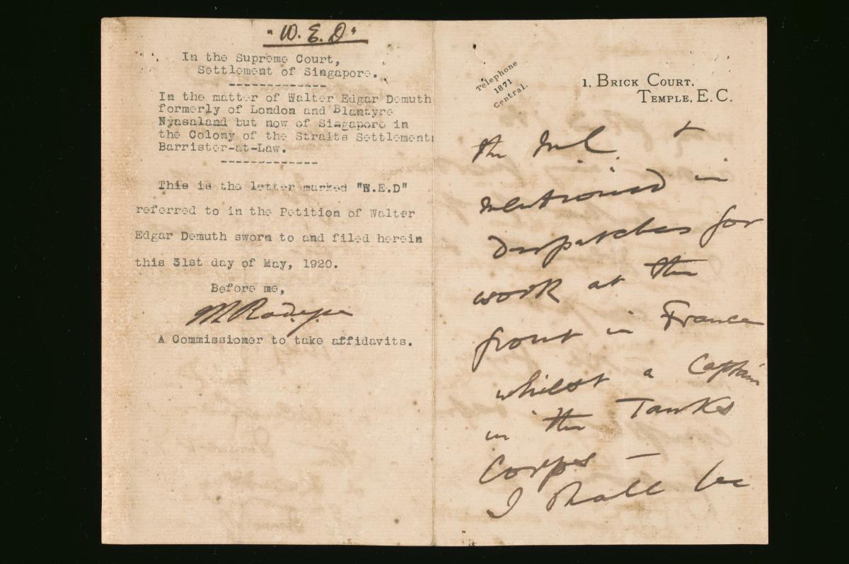 This is a testimonial dated 11 May 1921 for William Herbert Drummond written by Walter Edgar Demuth, a Barrister-at-Law, solicitor and advocate of the Straits Settlements. It is part of a collection of legal documents from the 19th and early 20th centuries which provides a glimpse into the work of the notable personalities who left their mark on Singapore’s legal history, and the economic and other transactions undertaken by ordinary immigrants in 19th century Singapore that tell stories of misfortune and indebtedness which would otherwise have disappeared from history.