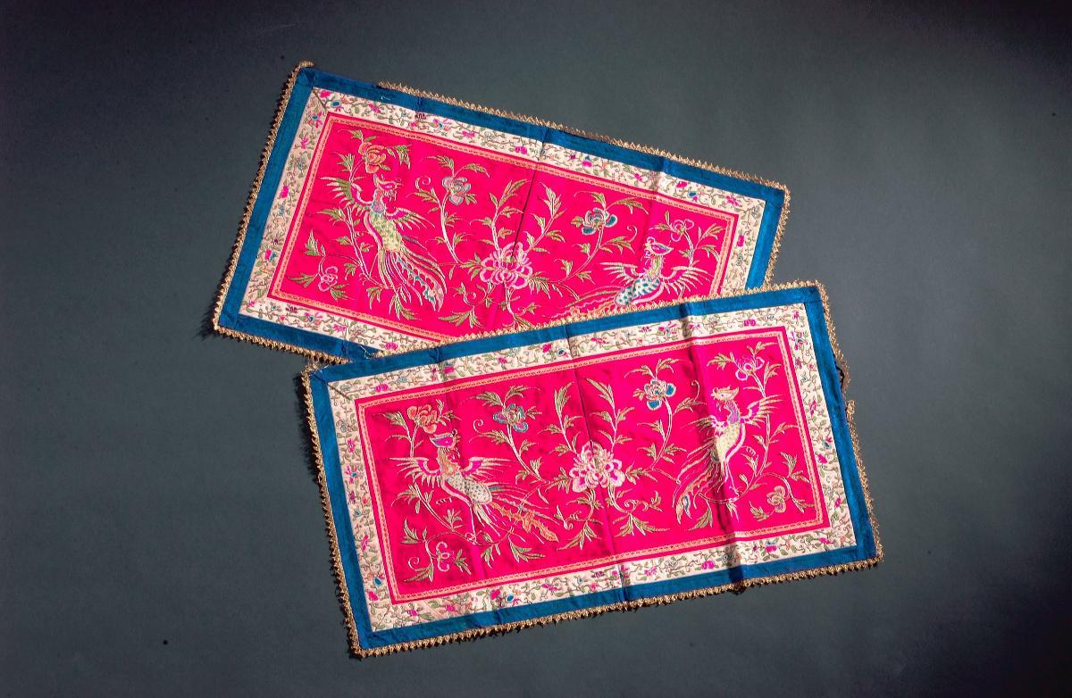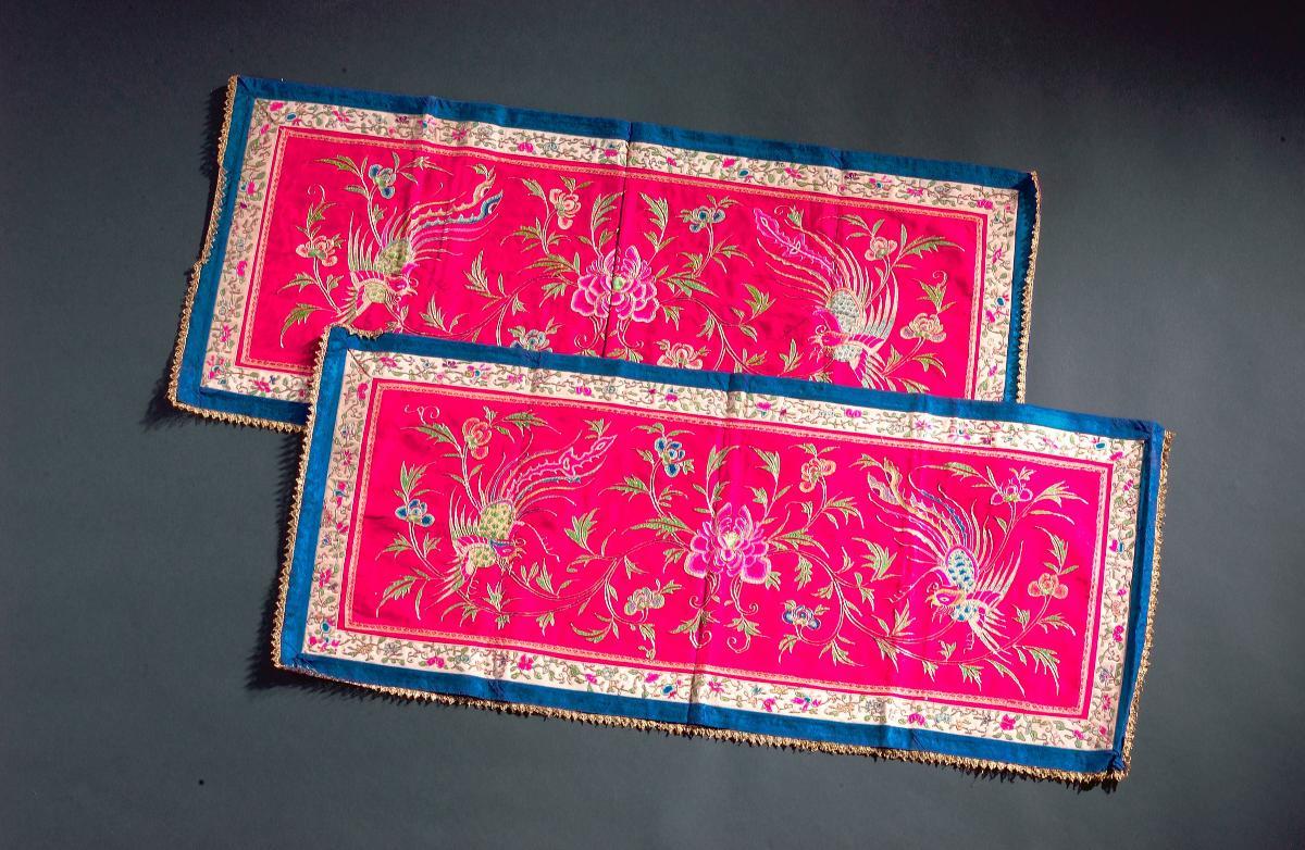 This pair of rectangular off-white embroidered panels is formed using the method of the satin stitch. It is a series of flat stitches that are used to completely cover a section of the background fabric so as to create a design. The centre portion of each panel consists of two pairs of stags and a pair of phoenixes. These animals are set amongst peony blossoms. These motifs are auspicious symbols in the Chinese culture. Peonies symbolised spring, which was considered an auspicious time to get married. They are also symbols of romance and love. The pair of phoenix symbolises the wedding couple and high virtue and grace.Stags signify longevity. Panels such as these had varied uses. They were traditionally used as table covers, panels for picture frames and ornamental hangings to name a few. This pair was possibly used as pillow covers in the bridal chamber.