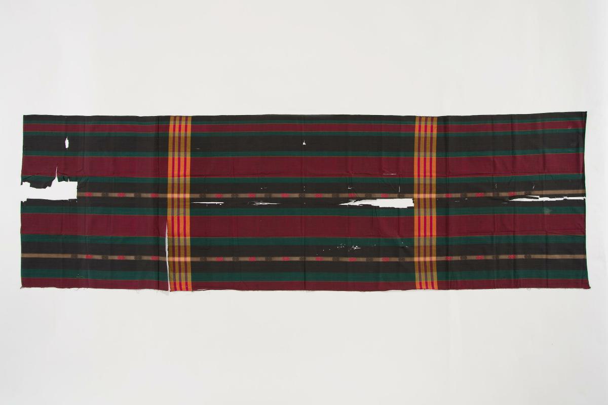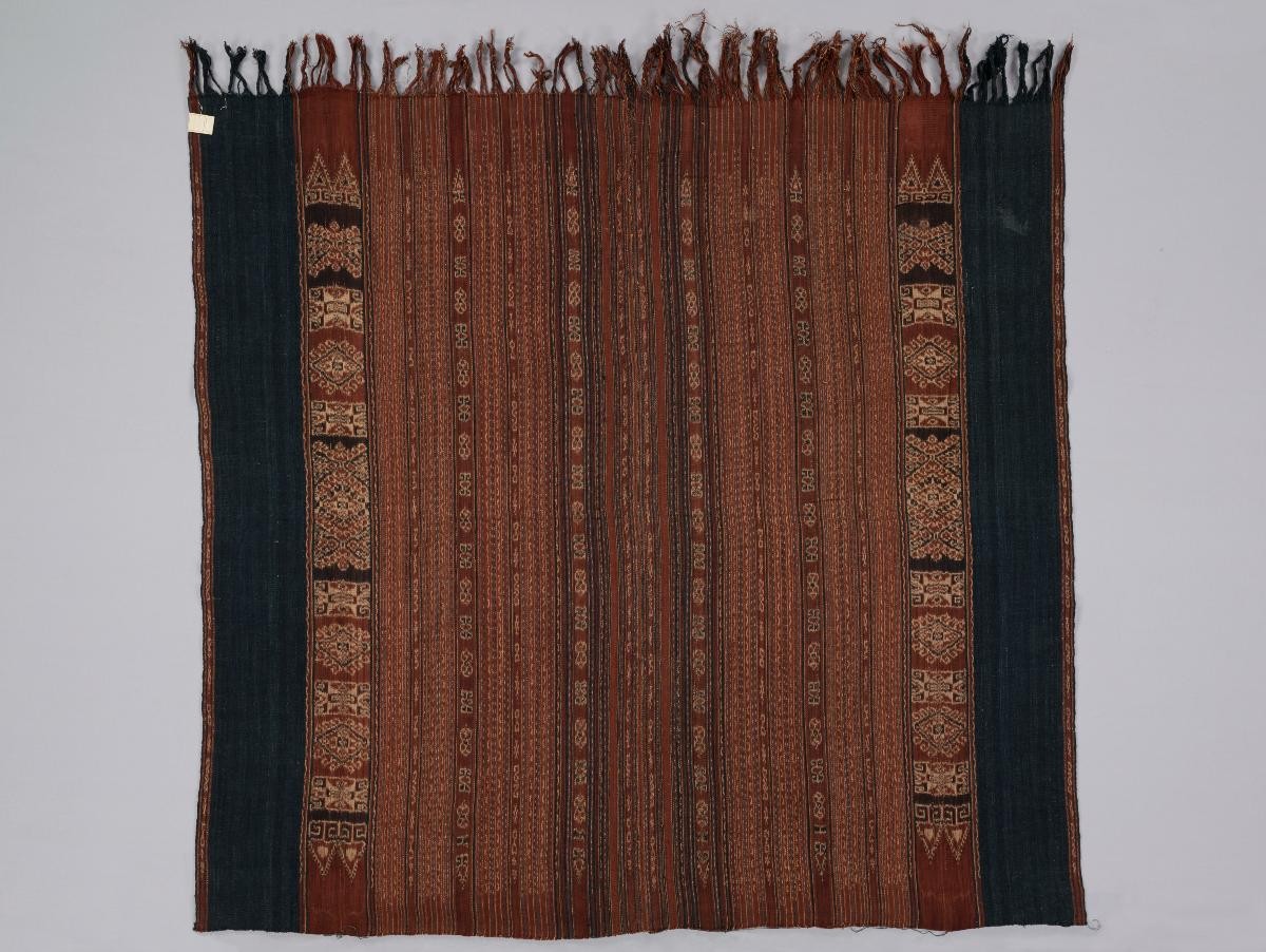 Such design—white weft stripes against an indigo field, and diamond patterning—is similar to dress blankets (can-lo puan) from the Haka area in the Northern Chin State, Burma. This type of blanket is traditionally worn by people of high status, such as women of the chief’s family. It is also used to wrap the head of a sacrificial buffalo or a buffalo foetus during some feasts.