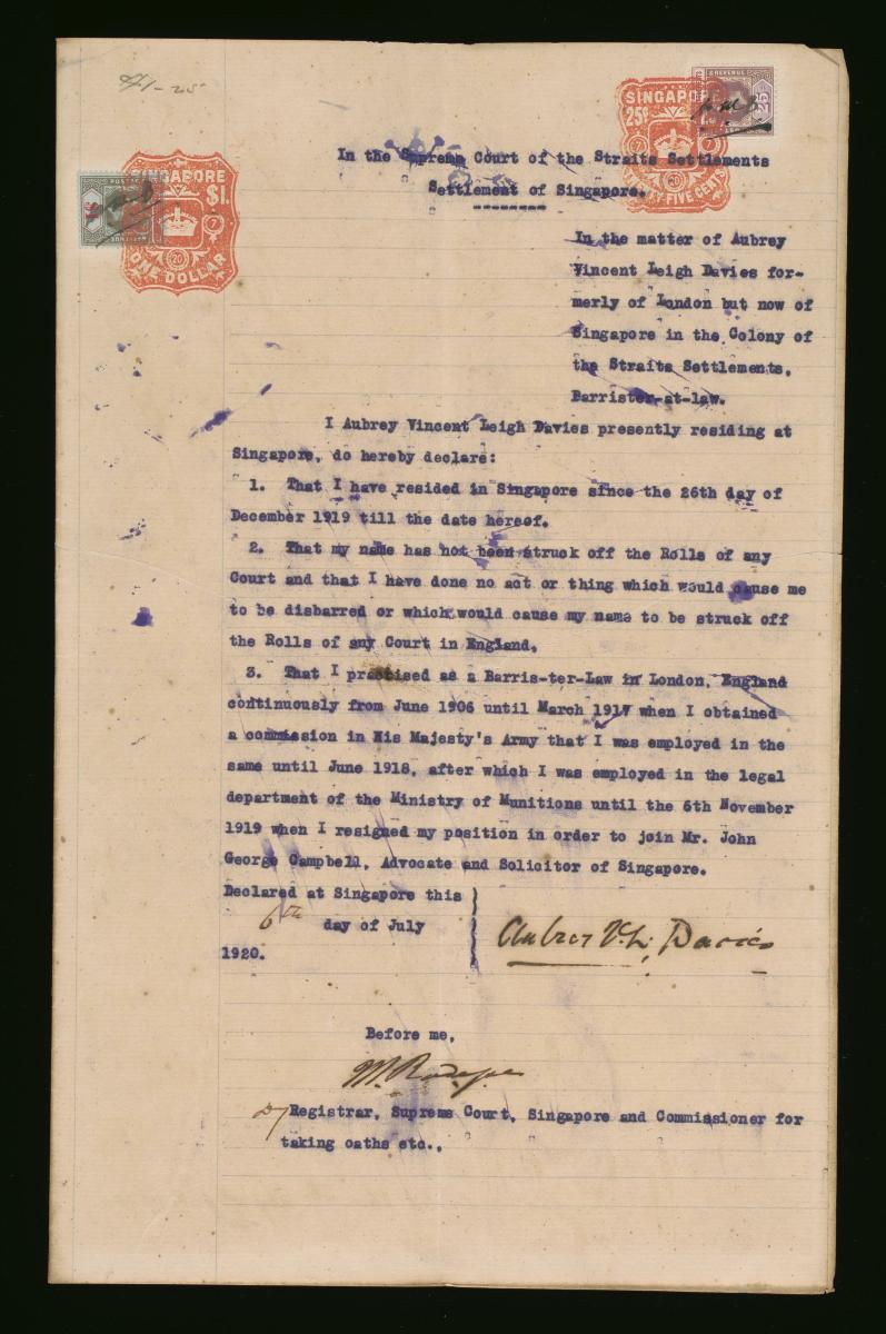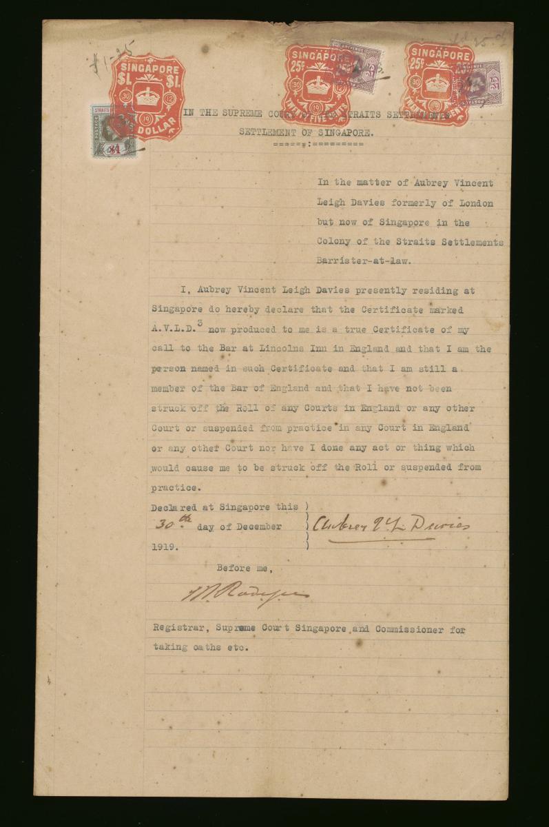 This is an oath sworn by Aubrey Vincent Leigh Davies on 19 July 1920. It is part of a collection of legal documents from the 19th and early 20th centuries which provides a glimpse into the work of the notable personalities who left their mark on Singapore’s legal history, and the economic and other transactions undertaken by ordinary immigrants in 19th century Singapore that tell stories of misfortune and indebtedness which would otherwise have disappeared from history.