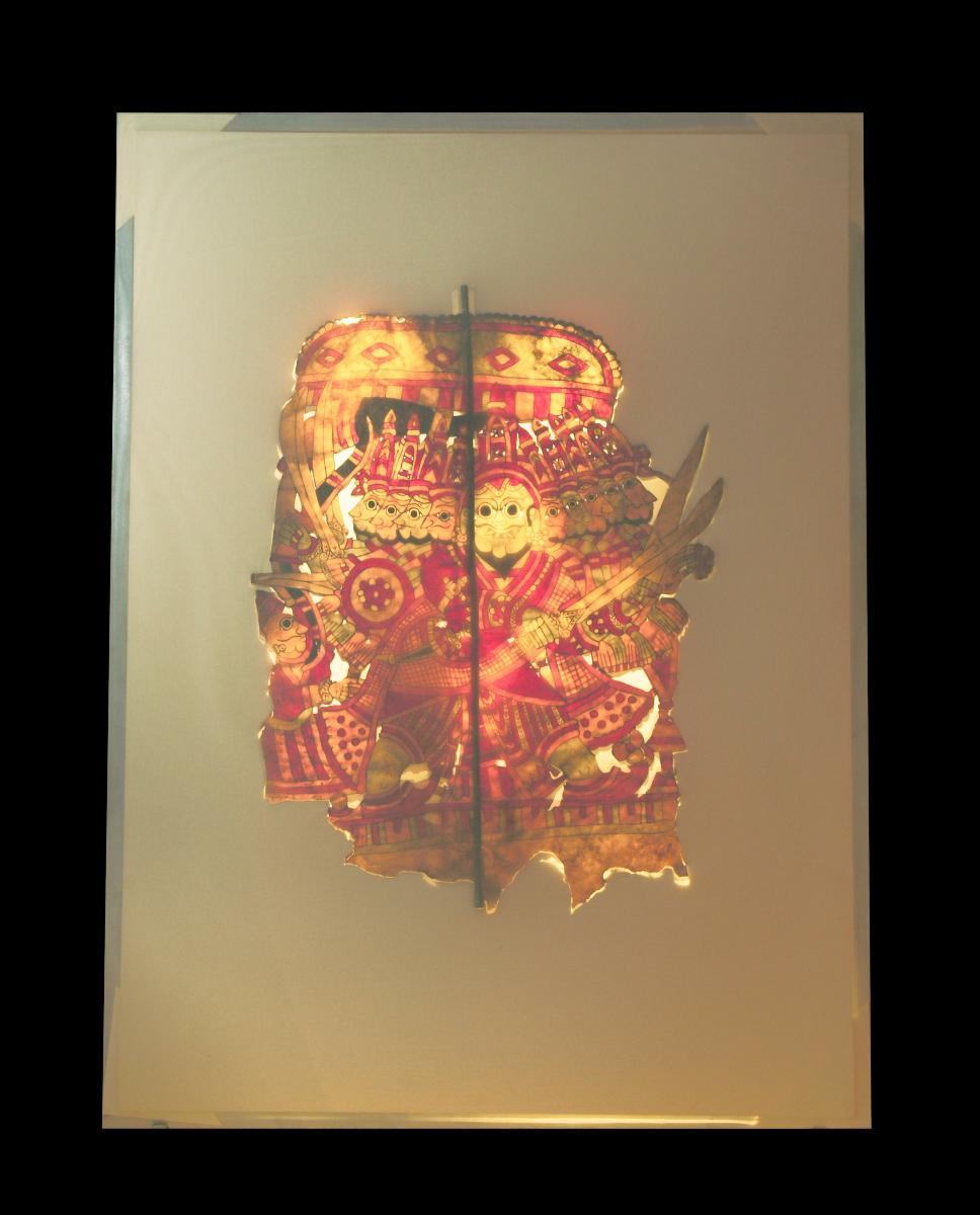 This is a leather puppet of Ravana. Ravana, the king of Lanka who abducted Sita, is a prominent character in the Ramayana. Sita’s husband, Rama, waged war on Ravana to rescue his wife. After a prolonged search, Sita was found in Lanka. Rama fought Ravana, killed him and rescued his wife. Puppets such as these are used for shadow plays, which are staged on festive occasions. Many of the themes are religious, drawn from epic myths, historical tales and sometimes fables. There are very few individual characters like Ravana and Hanuman. In the early days of these shadow puppets, they were strongly influenced by contemporary westernisation. Today, western cinema and popular culture have an effect on them, as shown in this puppet wearing riding boots. These puppets record the changing times of history.