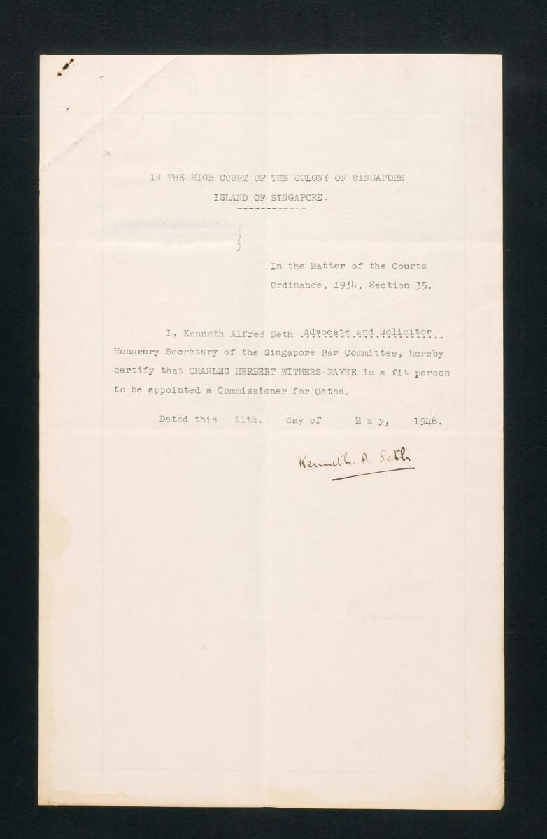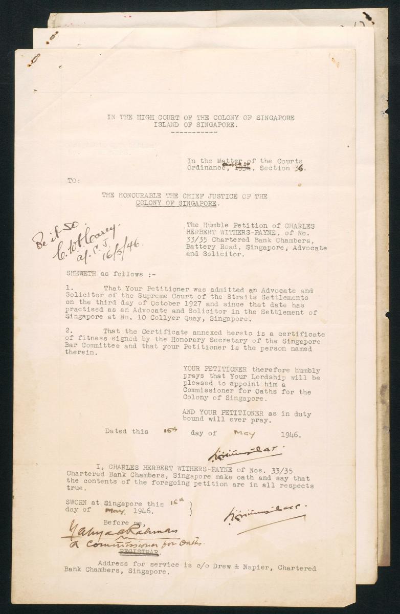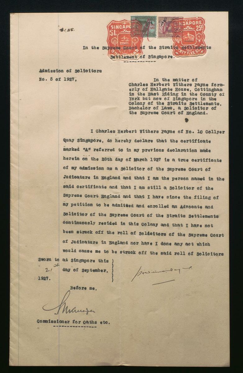 This is an oath sworn by Charles Herbert Withers Payne on 3 October 1927. It is part of a collection of legal documents from the 19th and early 20th centuries which provides a glimpse into the work of the notable personalities who left their mark on Singapore’s legal history, and the economic and other transactions undertaken by ordinary immigrants in 19th century Singapore that tell stories of misfortune and indebtedness which would otherwise have disappeared from history.