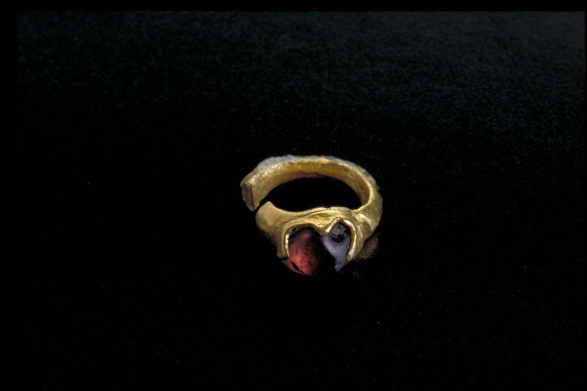 This ornament features a red stone on its band and a decorated vertical motif in solid. Due to the miniscule size of this ornament, it has been suggested that it could have been worn on the legs of pet birds, hence it is known as a ‘bird ring’. However, it is more likely that it was worn on the ear, and such tall gem-set earrings could possibly represent the thunderbolt of Indra, the king of gods in Hindu mythology. Both men and women wore ear ornaments and they had their earlobes pierced. Javanese statues belonging to this time period depict many styles of ear ornaments. Besides personal adornment, gold was also used to make religious items during this period.