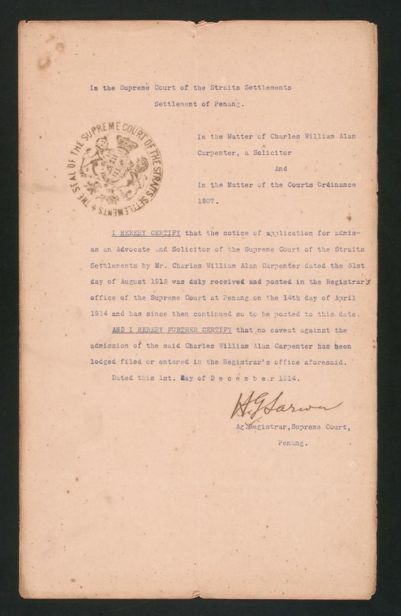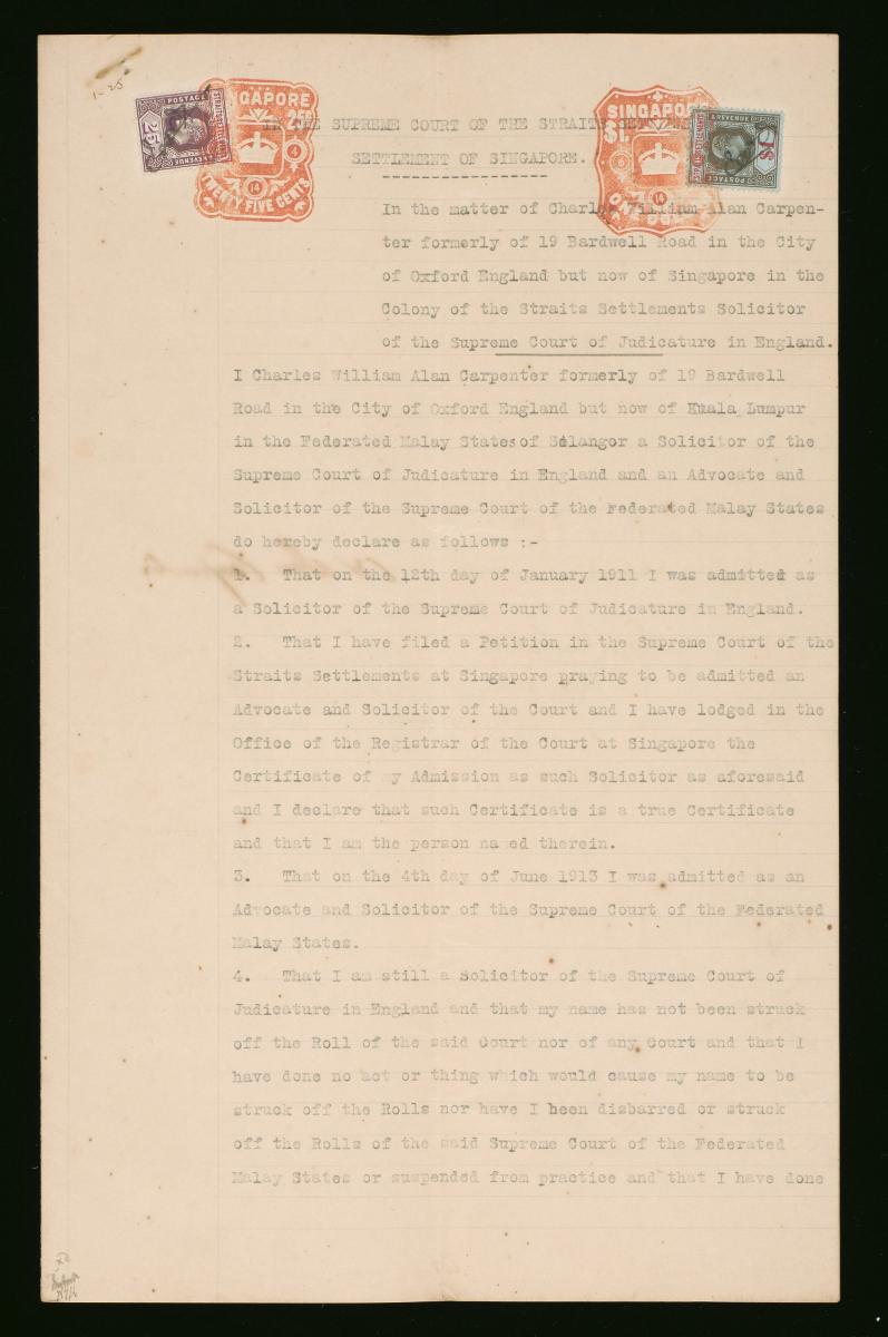 This is an oath sworn by Charles William Alan Carpenter on 1 February 1915. It is part of a collection of legal documents from the 19th and early 20th centuries which provides a glimpse into the work of the notable personalities who left their mark on Singapore’s legal history, and the economic and other transactions undertaken by ordinary immigrants in 19th century Singapore that tell stories of misfortune and indebtedness which would otherwise have disappeared from history.