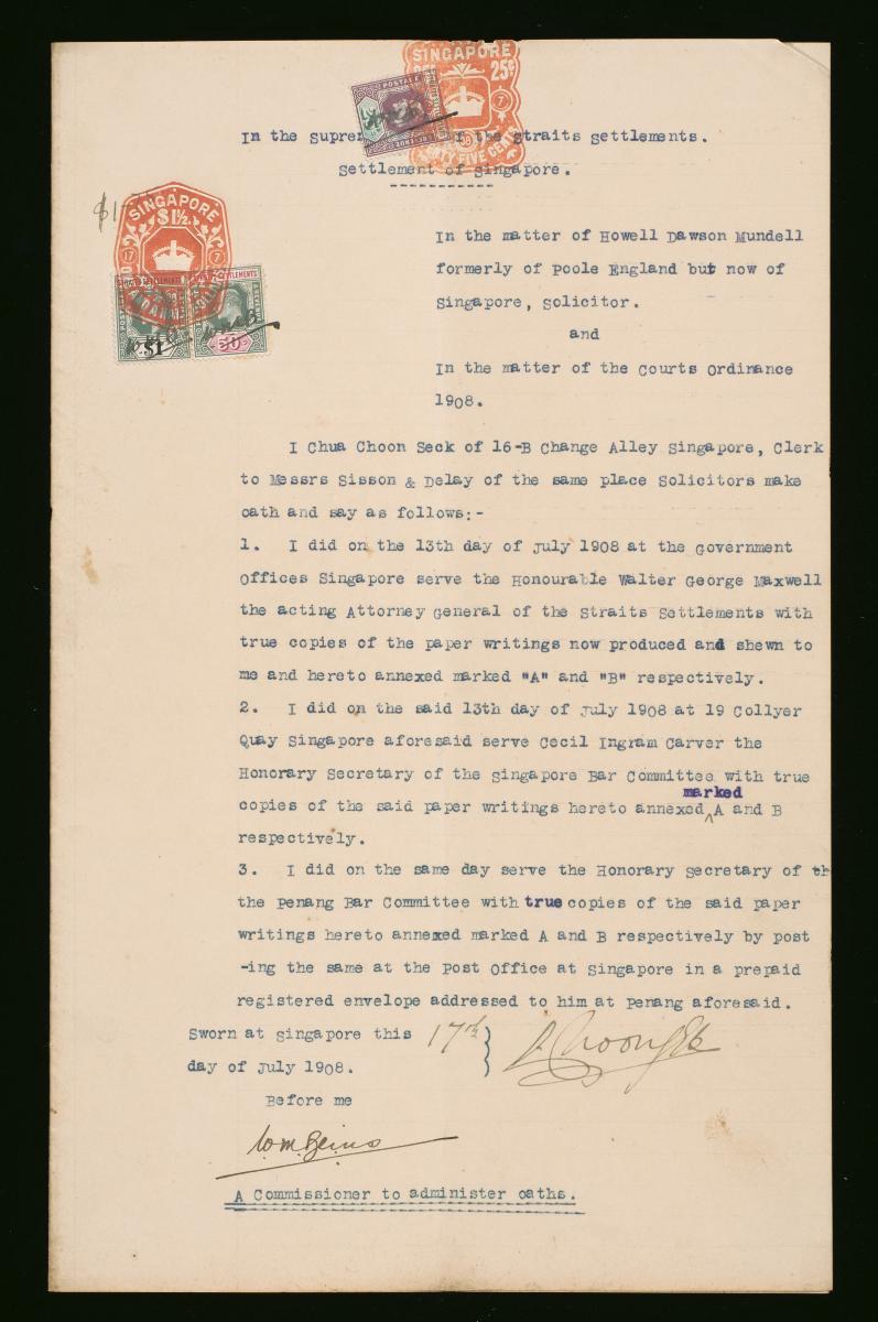 The is the declaration of Howell Dawson Mundell made on 6 July 1908. It is part of a collection of legal documents from the 19th and early 20th centuries which provides a glimpse into the work of the notable personalities who left their mark on Singapore’s legal history, and the economic and other transactions undertaken by ordinary immigrants in 19th century Singapore that tell stories of misfortune and indebtedness which would otherwise have disappeared from history.