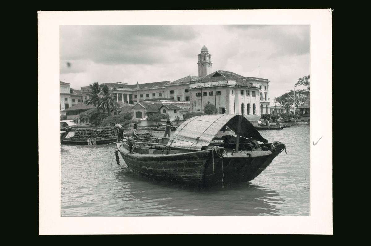 Born in Singapore in 1922, Ng Ah Kuan (also known as Ng Kuan) is a watercolourist who painted many scenes of Singapore in the 1960s and 1970s. In the 1960s, he was the chief artist in an advertising company. In 1975, Ng was commissioned to design the Hundred Dollar Commemorative Coin, which was issued to commemorate the tenth anniversary of Singapore’s independence; the theme was the successful public housing programme that had begun in 1960.Ng Kuan has captured in his work many iconic buildings and places around Singapore. ‘Singapore River’ is a work that typifies Ng’s subject oeuvre in art. Rendered in his trademark medium, watercolour, the work records the Singapore skyline of the Central Business District as seen along the quayside at the Singapore River. The Supreme Court is visible in the far background, starkly set off by the old wooden houses in the foreground.