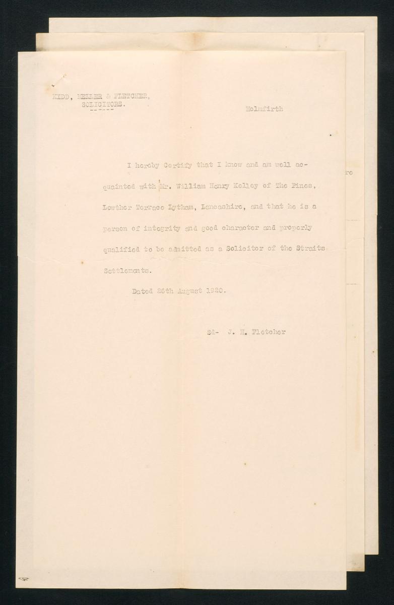 This is a testimonial for William Henry Kelley dated 25 August 1920 from Frank Tite, formerly the curate of Lytham Parish Church. It is part of a collection of legal documents from the 19th and early 20th centuries which provides a glimpse into the work of the notable personalities who left their mark on Singapore’s legal history, and the economic and other transactions undertaken by ordinary immigrants in 19th century Singapore that tell stories of misfortune and indebtedness which would otherwise have disappeared from history.