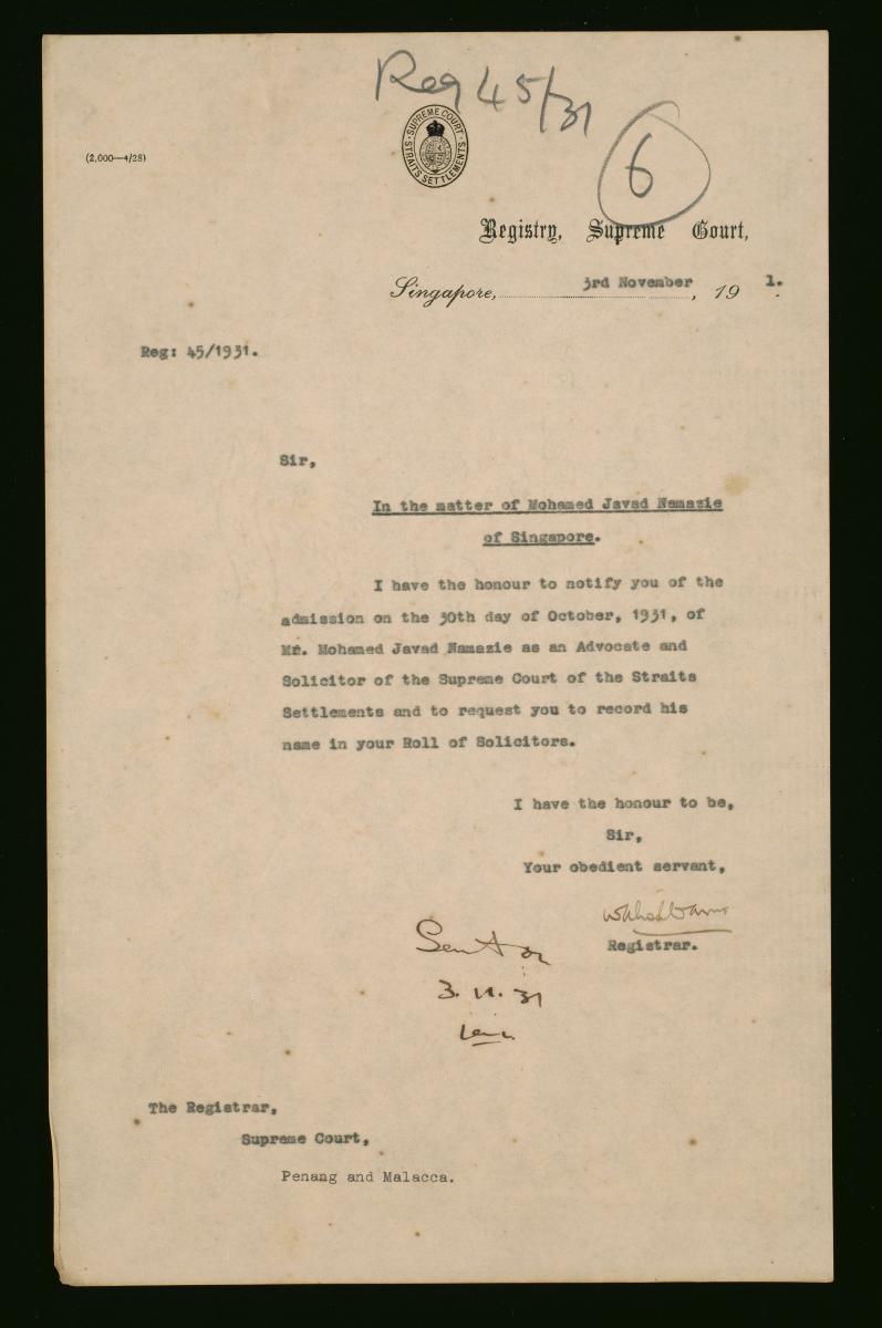 This is a draft of a letter dated 23 November 1921 to the Registrars of the Supreme Court of the Straits Settlements in Penang, Malacca and Labuan. It is part of a collection of legal documents from the 19th and early 20th centuries which provides a glimpse into the work of the notable personalities who left their mark on Singapore’s legal history, and the economic and other transactions undertaken by ordinary immigrants in 19th century Singapore that tell stories of misfortune and indebtedness which would otherwise have disappeared from history.