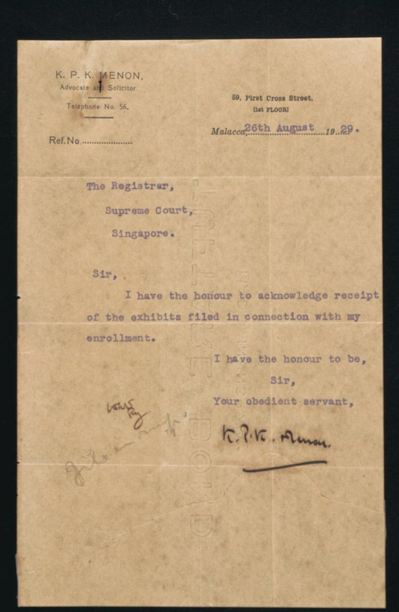 This is an order issued by the Supreme Court of the Straits Settlements on 8 February 1928 concerning the petition of K. P. K. Menon for admission as a solicitor and advocate to the Court. It is part of a collection of legal documents from the 19th and early 20th centuries which provides a glimpse into the work of the notable personalities who left their mark on Singapore’s legal history, and the economic and other transactions undertaken by ordinary immigrants in 19th century Singapore that tell stories of misfortune and indebtedness which would otherwise have disappeared from history.